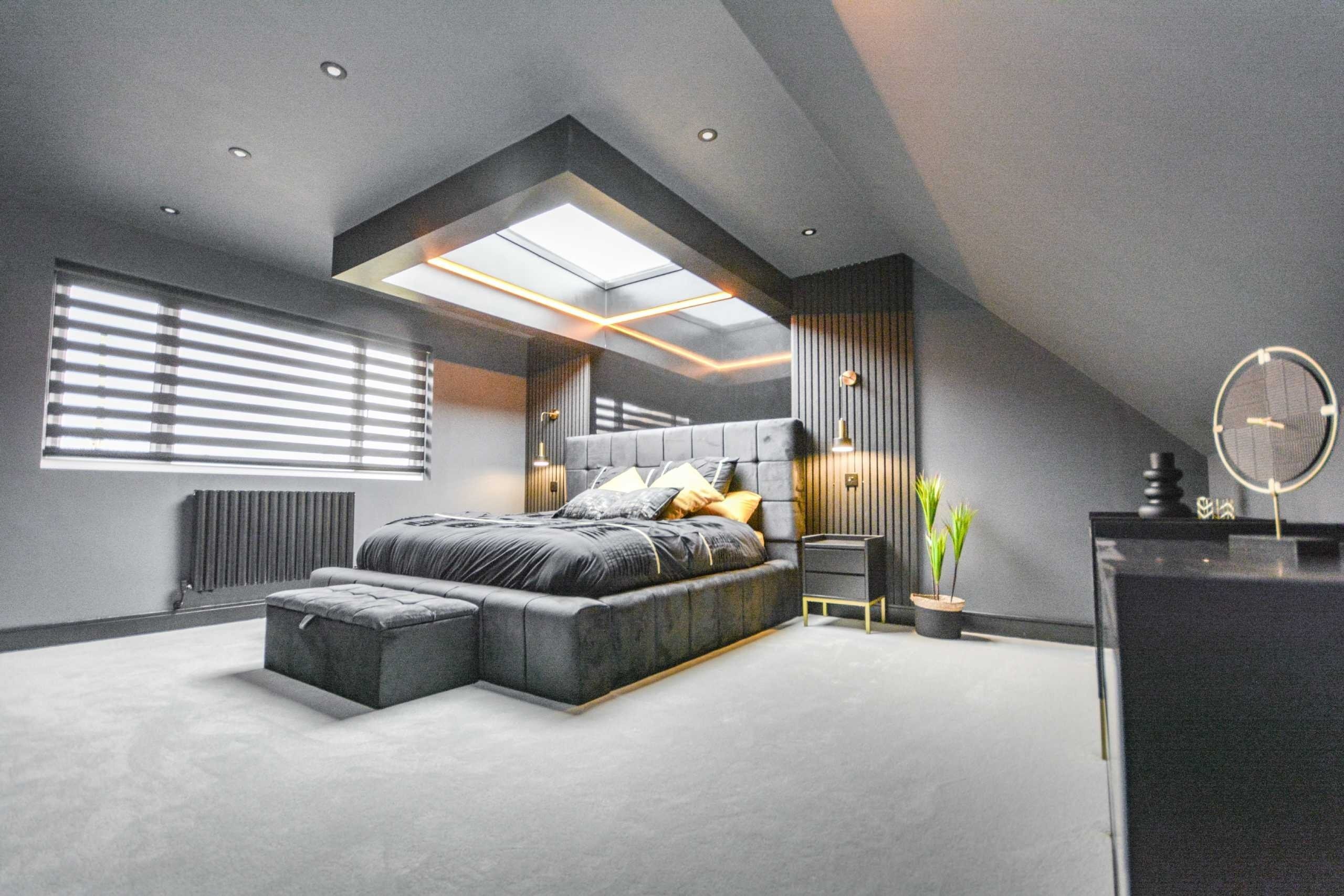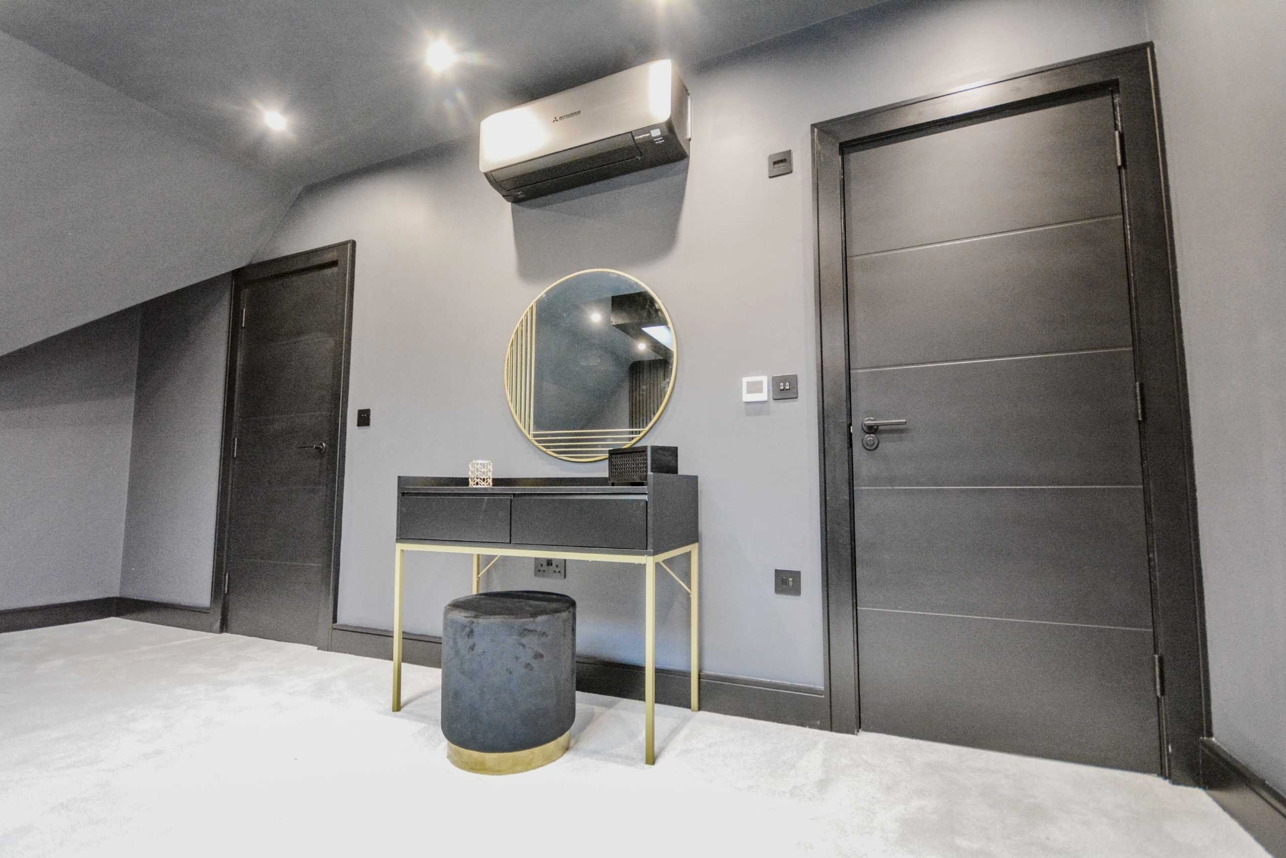 Upstairs, the stunning primary bedroom features skylights, air conditioning, and a luxurious en-suite with a walk-in shower. A modern family bathroom and additional air-conditioned bedrooms complete this elegant home. Throughout, you'll find beautiful herringbone flooring, adding a touch of sophistication.