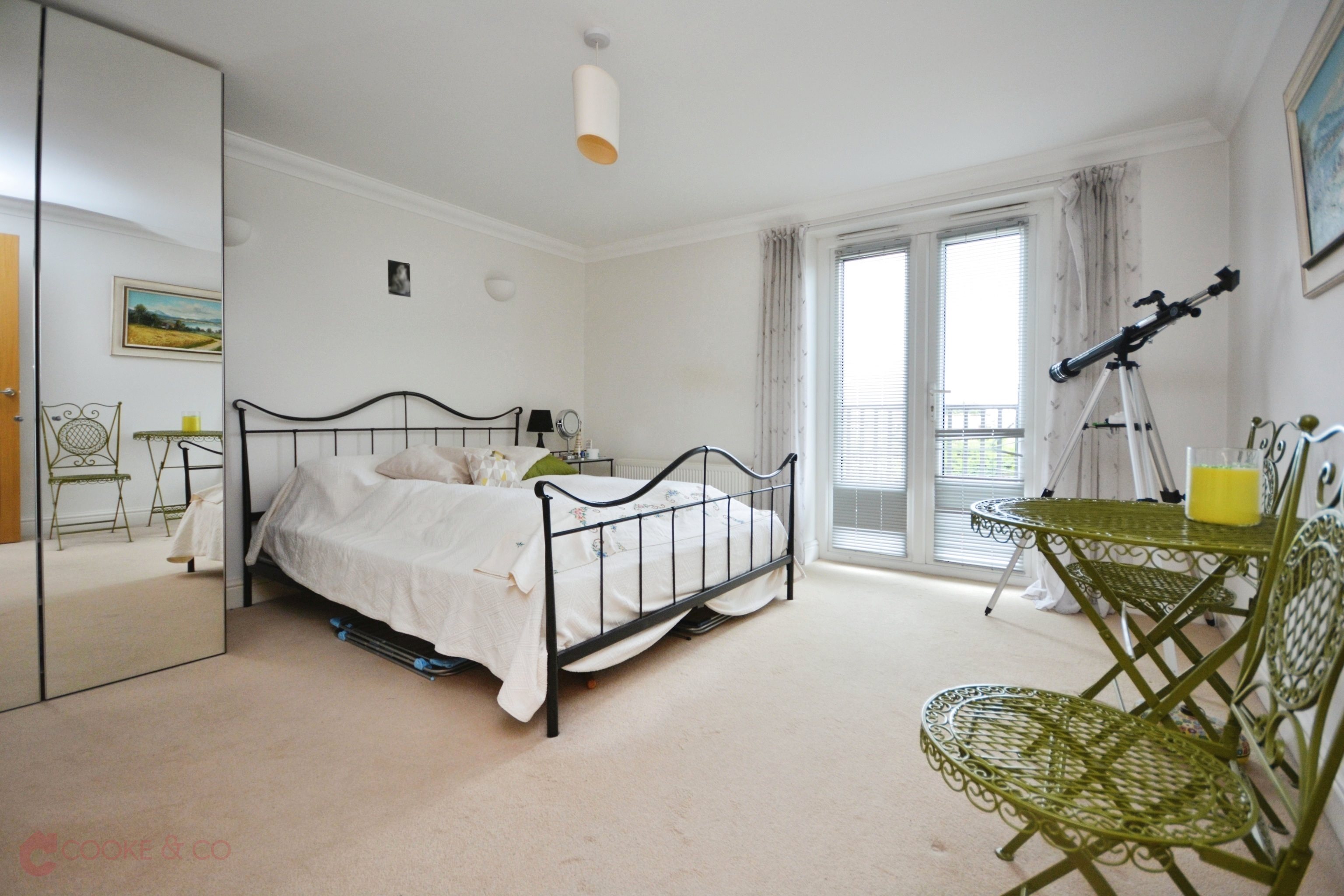 The primary bedroom is a serene retreat, complete with its own private balcony and a stylish en-suite shower room. A second double bedroom offers additional comfort, complemented by a well-appointed family bathroom.