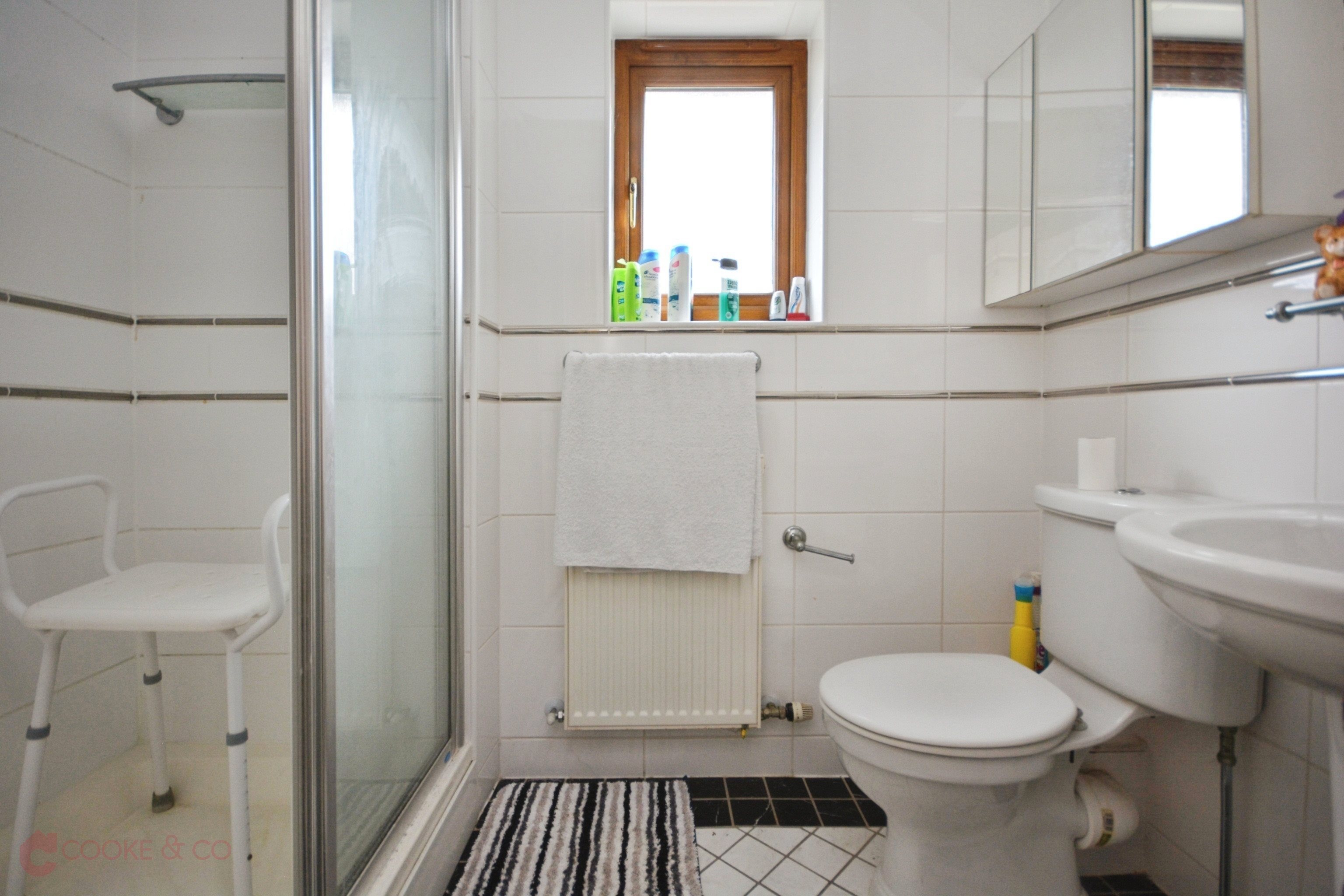Frosted window to rear, radiator, tiled flooring and walls, shower cubicle, radiator, sink with mixers