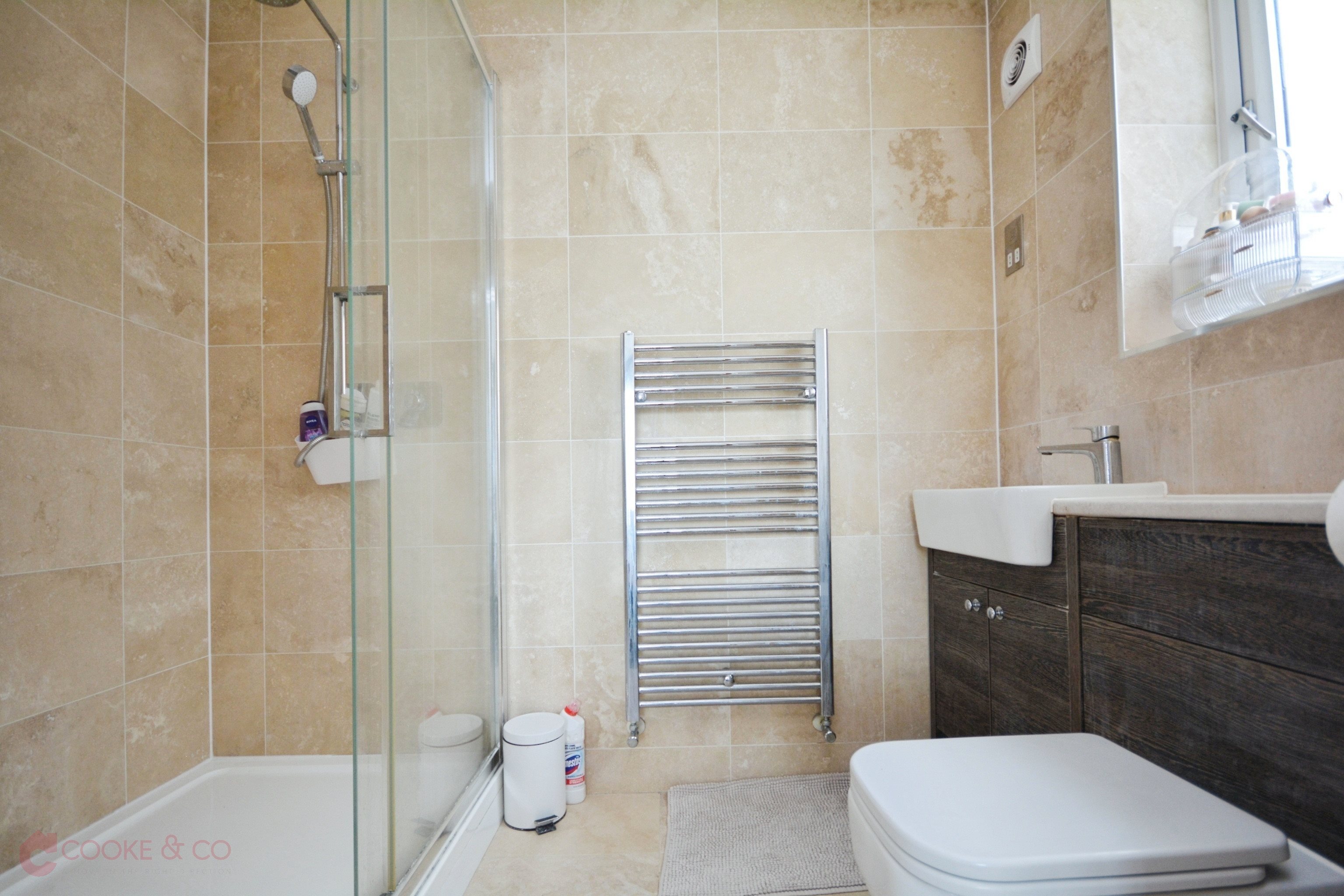 Window to side, walk in shower, heated chrome towel rail, tiled flooring