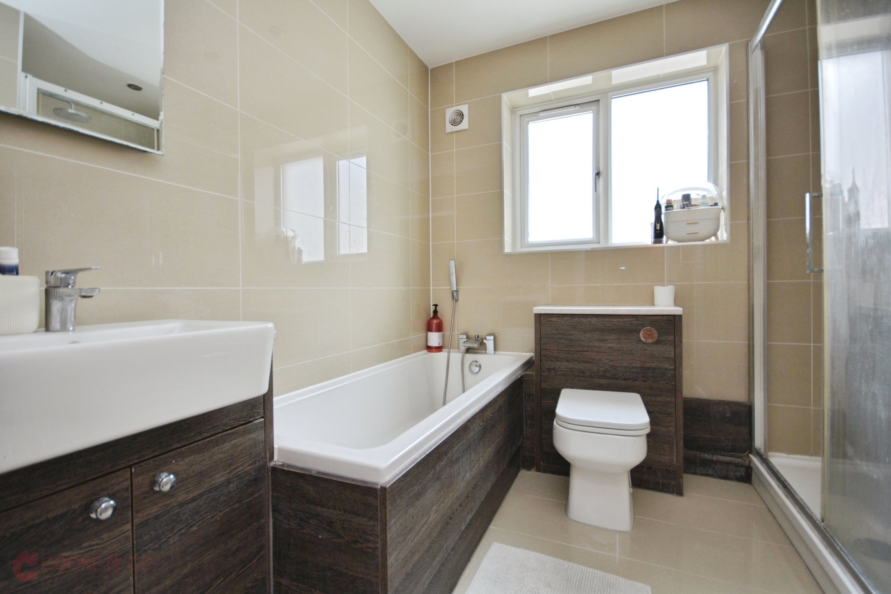 Frosted window to side, bath with shower attachments, sink with mixers, low level, tiled walls and flooring, heated chrome towel rail.