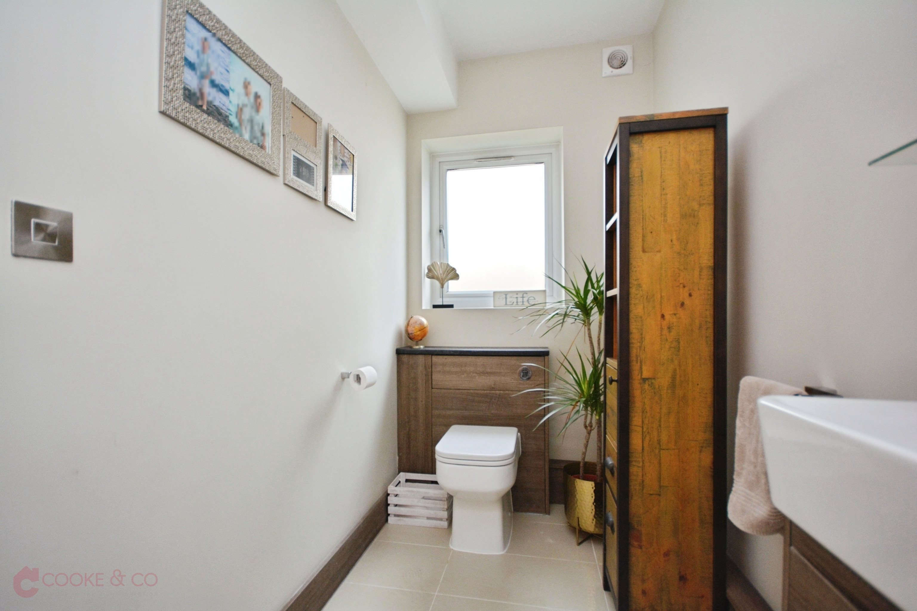 Window frosted to side, tiled flooring, sink with mixers, low level w/c, skirting