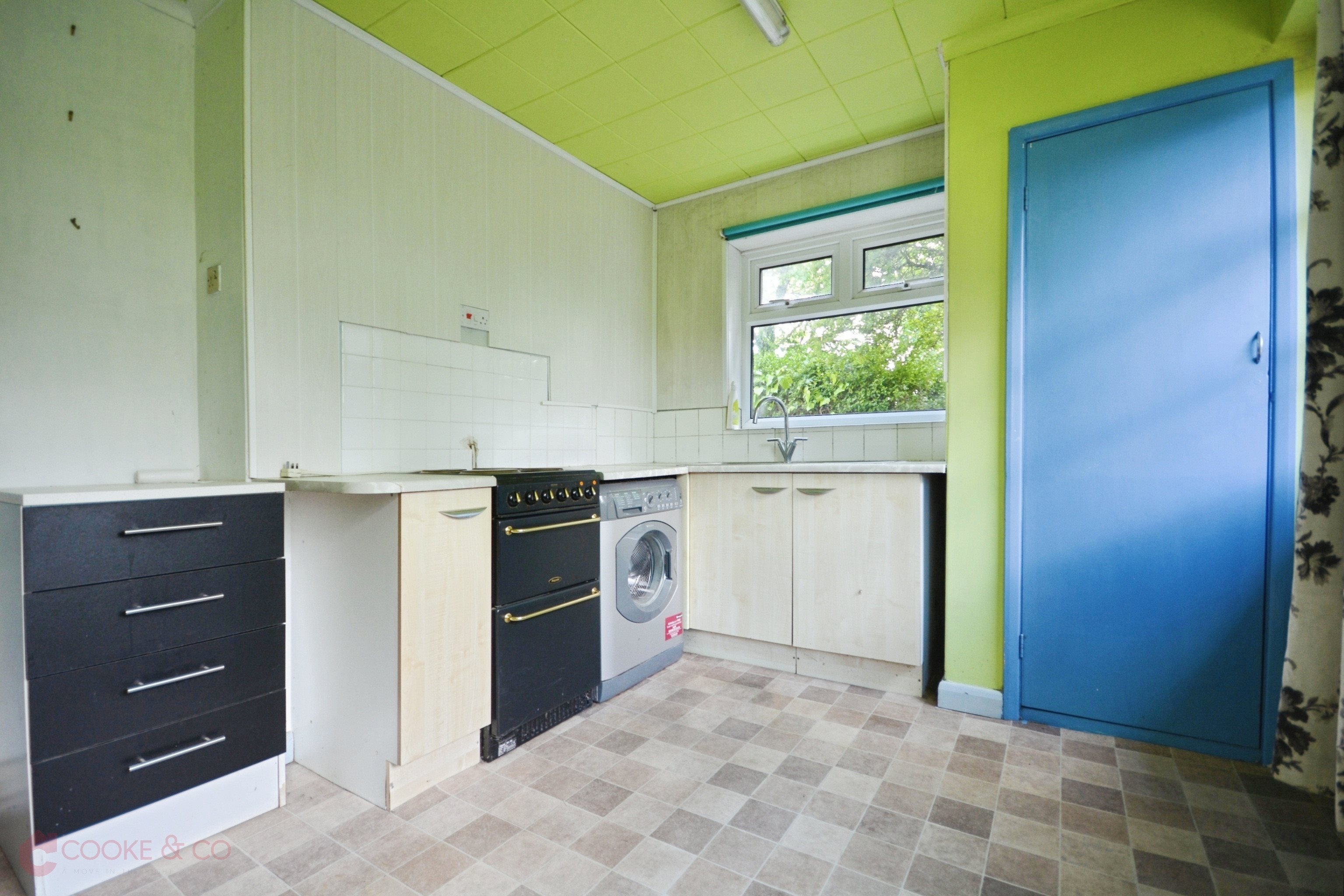 Windows to rear and side, vinyl flooring? Matching array of wall and base units with complimentary work surfaces, space and plumbing for washing machine, space for oven, stainless steel sink with mixer taps, vinyl flooring, skirting and coving, space for fridge freezer. Power points.