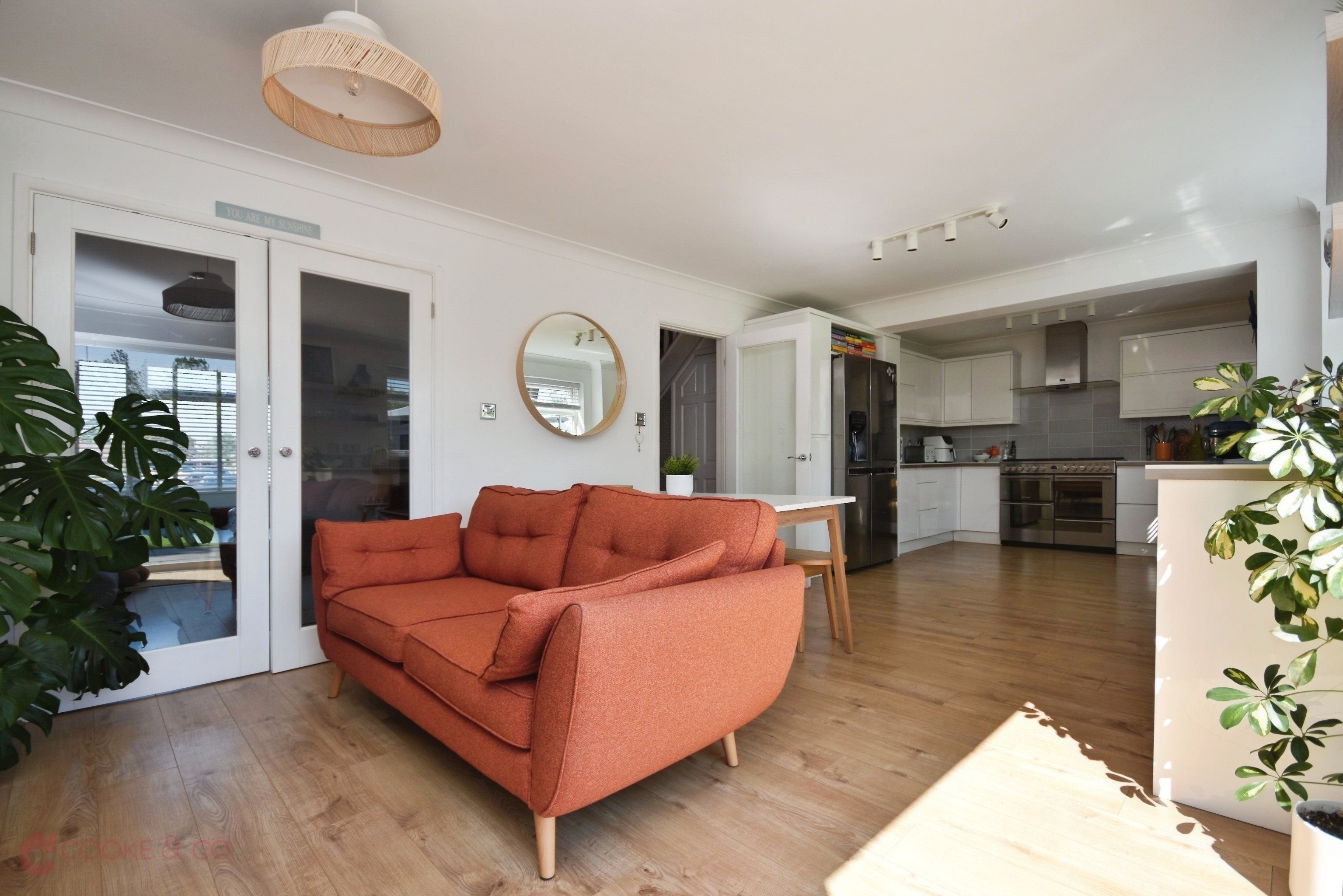 Windows to rear, laminate flooring, pull out larder, integrated dish washer, free standing oven, integrated washing machine, sink with mixers and draining board, tiled splash backs, stable door to rear garden, french double doors to rear garden, power points, TV point, radiator.