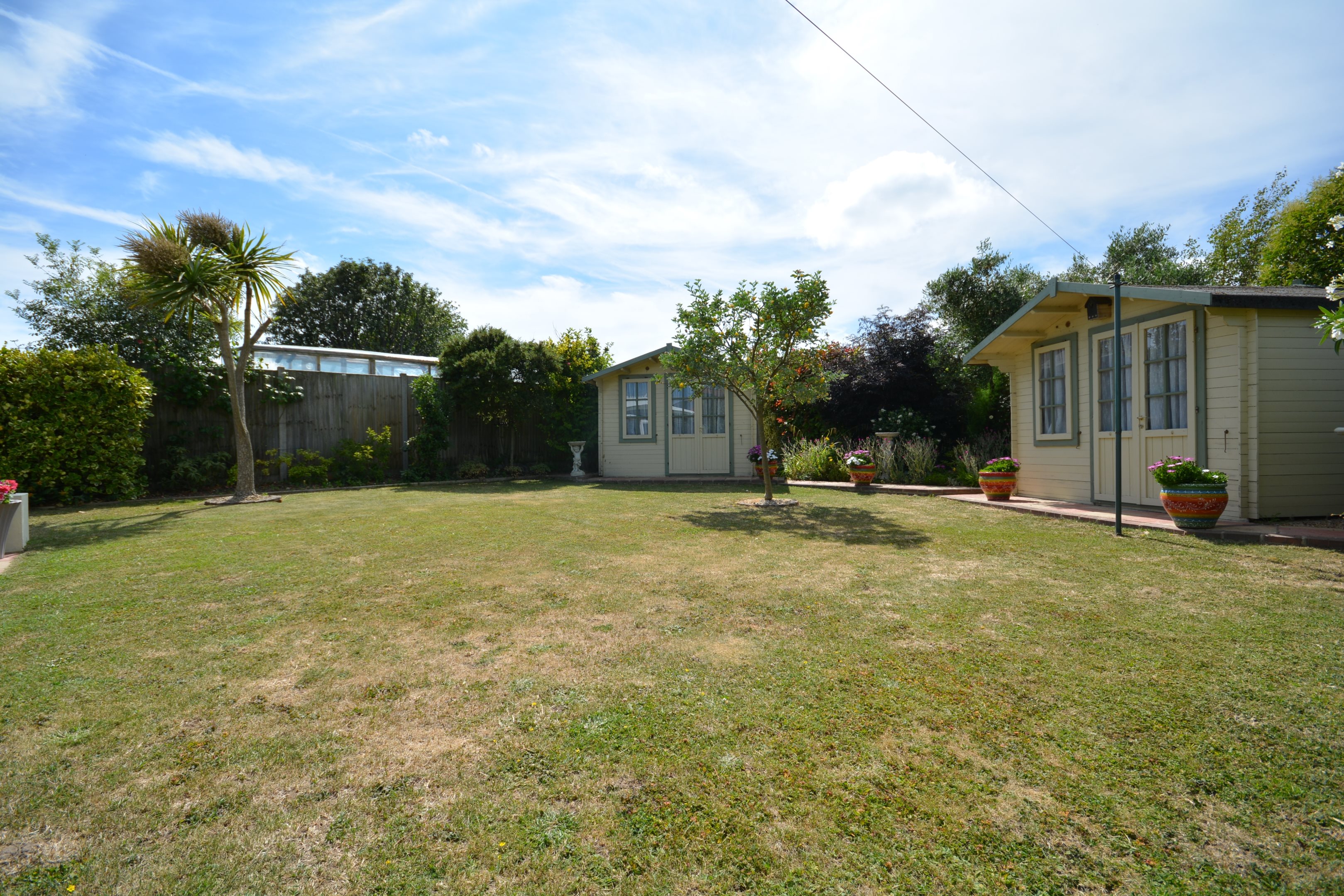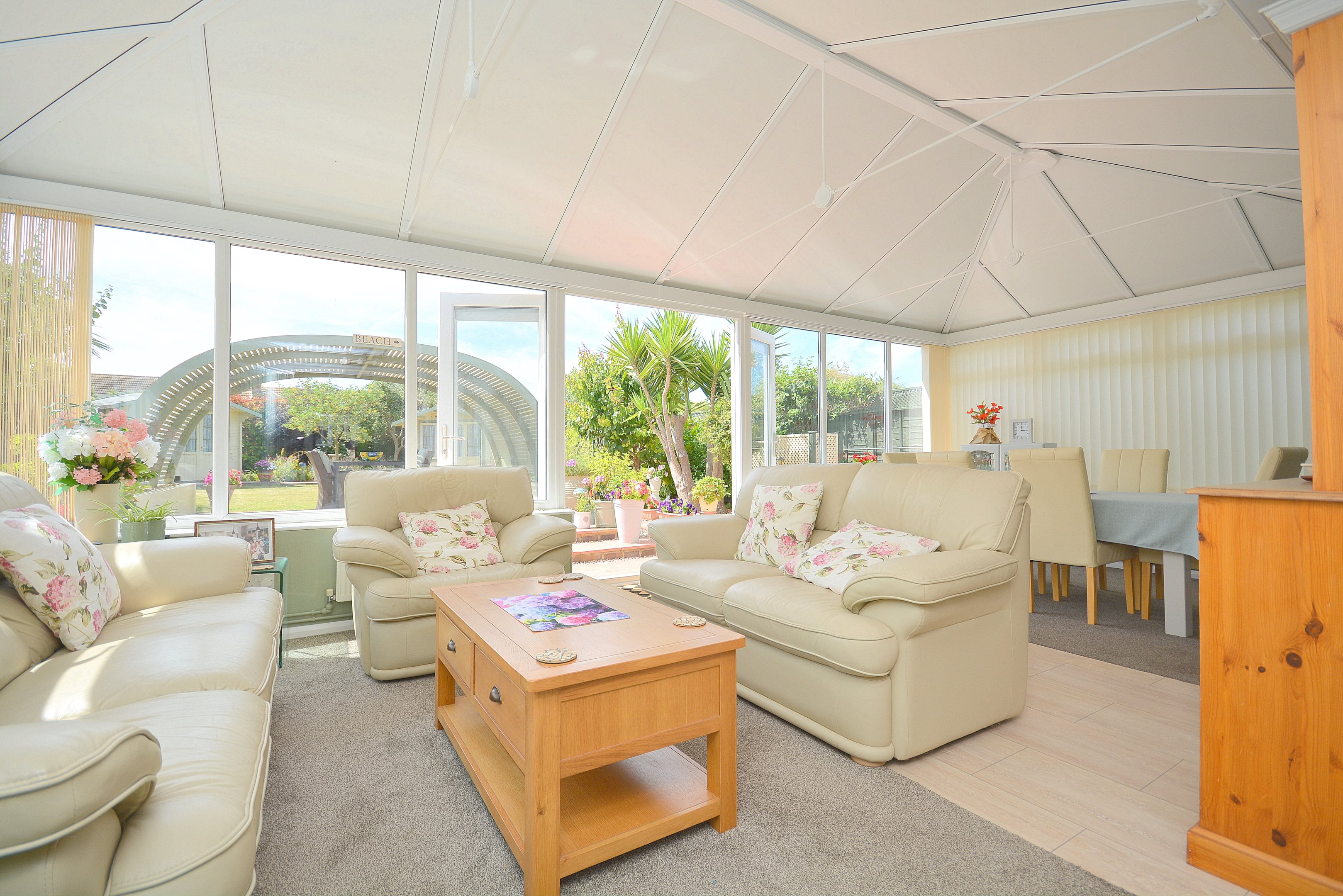 Sliding glass curtains to rear, opening on to:Sun Room24'4 x 12'1 (7.42m x 3.68m)Double-glazed windows to rear and sides. Power points. Radiators. Double-glazed French doors to rear leading to garden.Kitchen13'3 x 10'9 (4.04m x 3.28m)Matching wall and base units with butcher's block work surface. Splashback tiles. Matching kitchen island. 1½ bowl acrylic sink unit with mixer tap and drainer. Integrated oven and hob. Space and plumbing for washing machine and dishwasher. Space for American-style fridge/freezer. Built-in pantry. Sliding glass curtains to rear, leading to conservatory.Bedroom One13'3 x 11' (4.04m x 3.35m)Double-glazed window to front. Radiator. Power points. Built-in cupboards. Door to:Walk-In Wardrobe10'9 x 10'6 (at widest point) (3.28m x 3.2m (at widest point))Glass shower cubicle with mains shower over. Panelled bath with mixer tap. Sink with vanity unit. Low-level WC. Built-in storage cupboard. Radiator. Extractor fan. Double-glazed window to rear. Door to:Bedroom Two9'9 x 9'4 (2.97m x 2.84m)Double-glazed window to front. Radiator. Power points.Shower Room5'7 x 5'6 (1.7m x 1.68m)Wash hand basin with mixer tap set into vanity unit. Low-level WC. Corner shower cubicle with mains shower over. Extractor fan. Radiator. Double-glazed frosted window to side.GardenWest-facing. Large patio area with pergola. Mainly laid to lawn with mature shrubs and borders. Two sheds. Section of artificial grass and additional patio area. Side access. Side access. Access to.Garage16'3 x 8'5 (4.95m x 2.57m)Immersion tank. Boiler. Gas and electric meters. Electric roller door.Front GardenMainly paved, offering ample off street parking.