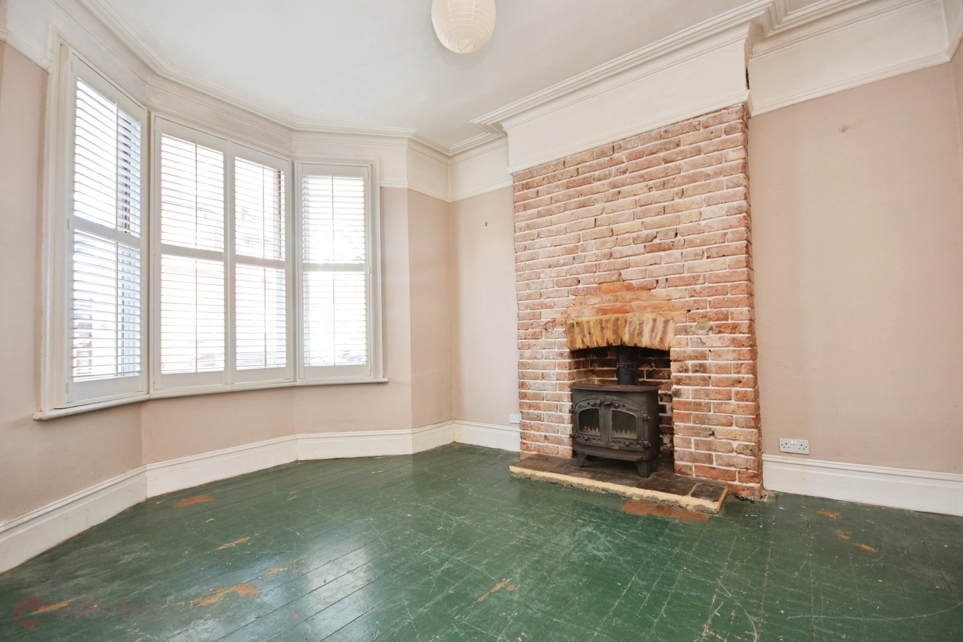 Bay window to front, wooden floor boards, log burner with brick surround, picture rails, skirting and coving, radiator. Door with access to-