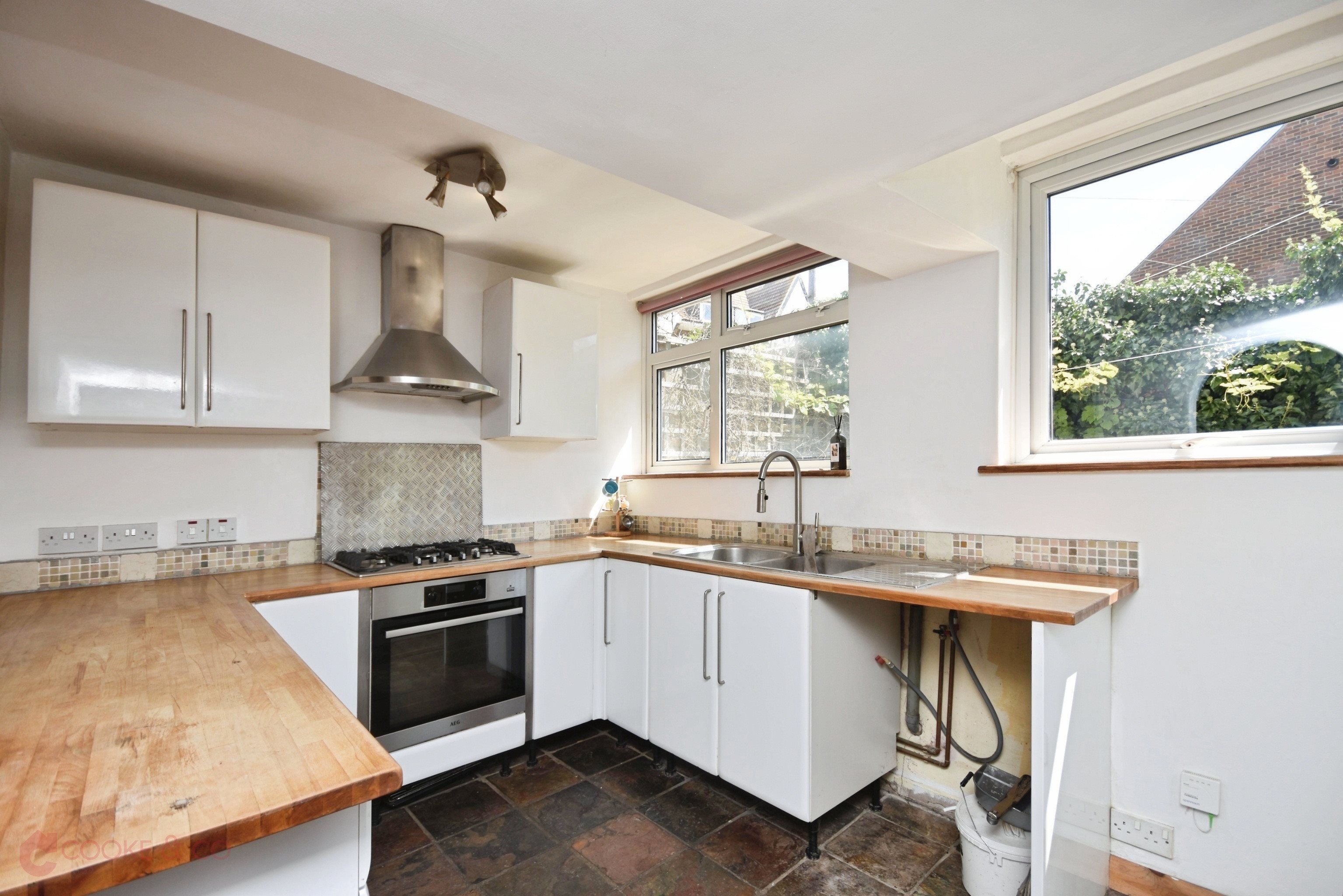 Tiled flooring, windows to rear, tiled splash backs, stainless steel sink with mixers, integrated oven and five burner gas hob, extractor hood, space and oncoming for washing machine, walk in pantry cupboard, power points. Door with access to rear garden.