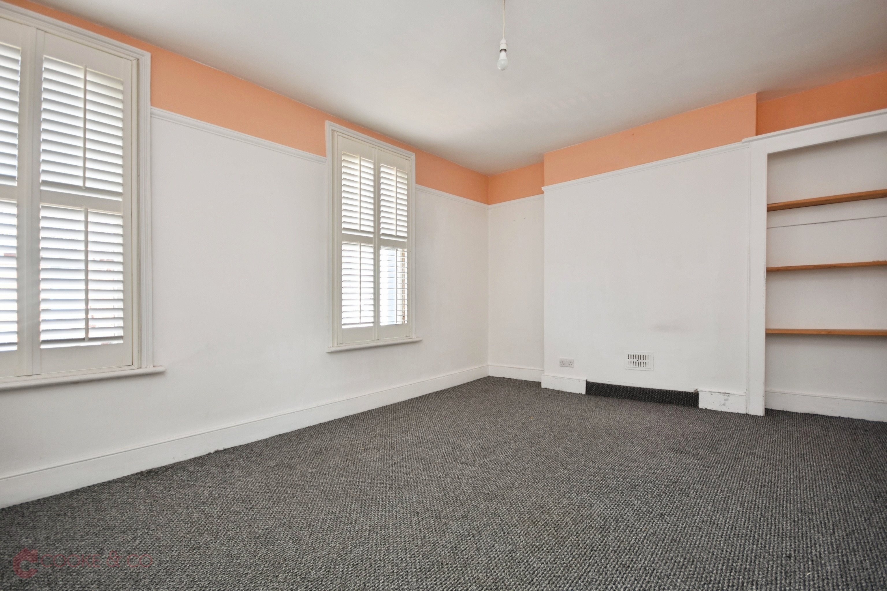 Carpeted, windows to front, radiator, picture rails and skirting, built in shelving units.