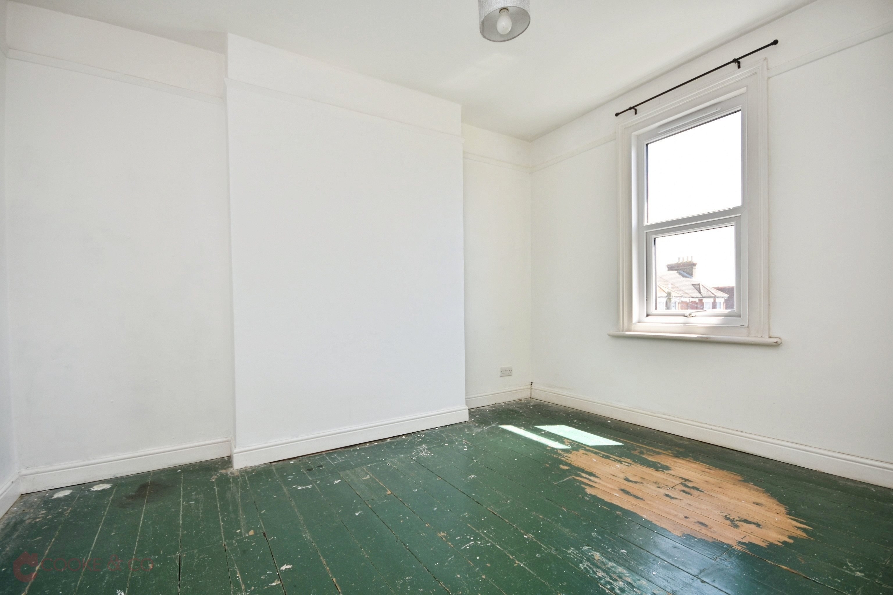 Window to rear with sea view, wooden floor boards, power pints, picture rails and skirting.