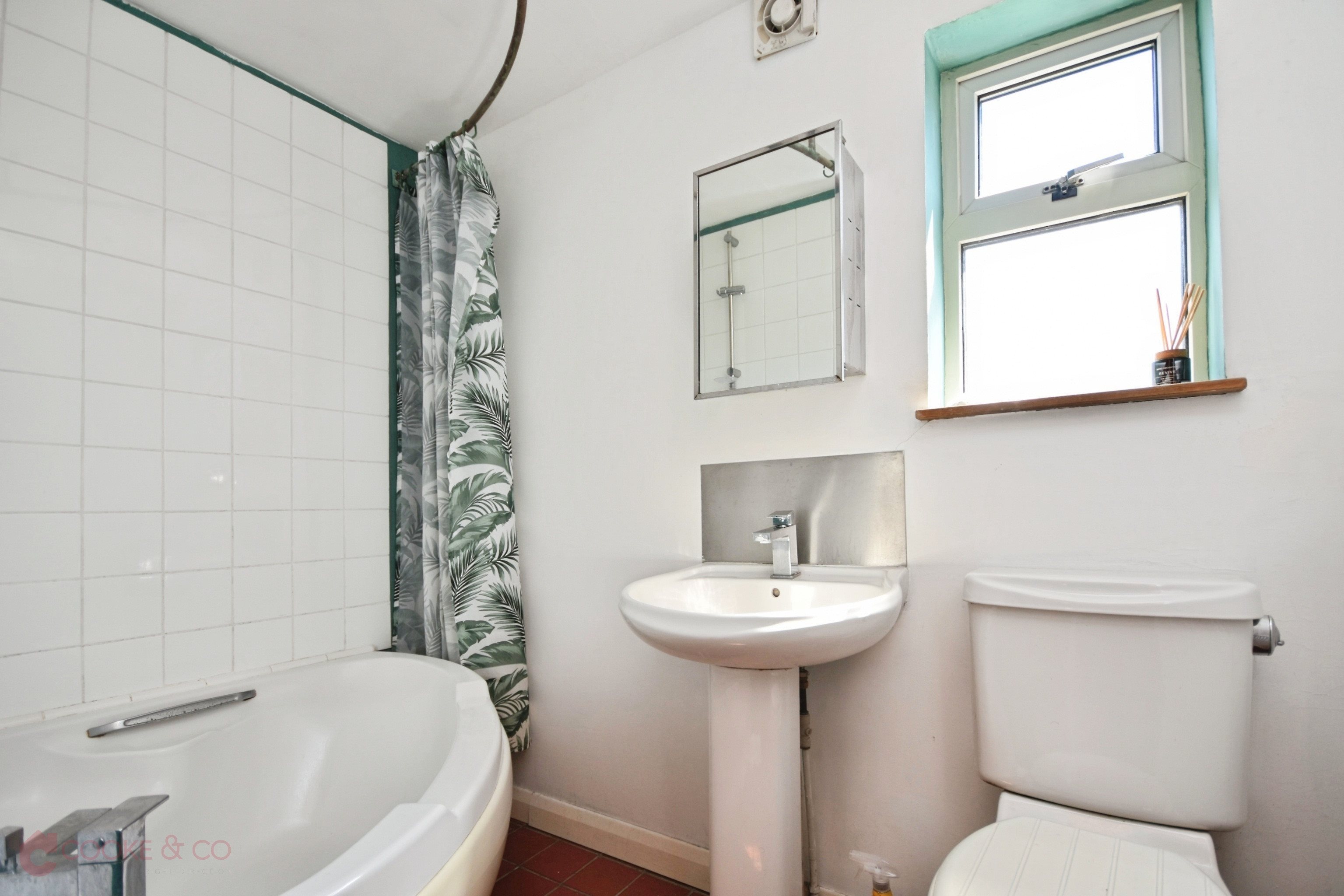 Frosted window to rear, bath with shower attachments, tiled flooring, sink with mixers, low level w/c, radiator, tiled splash backs.