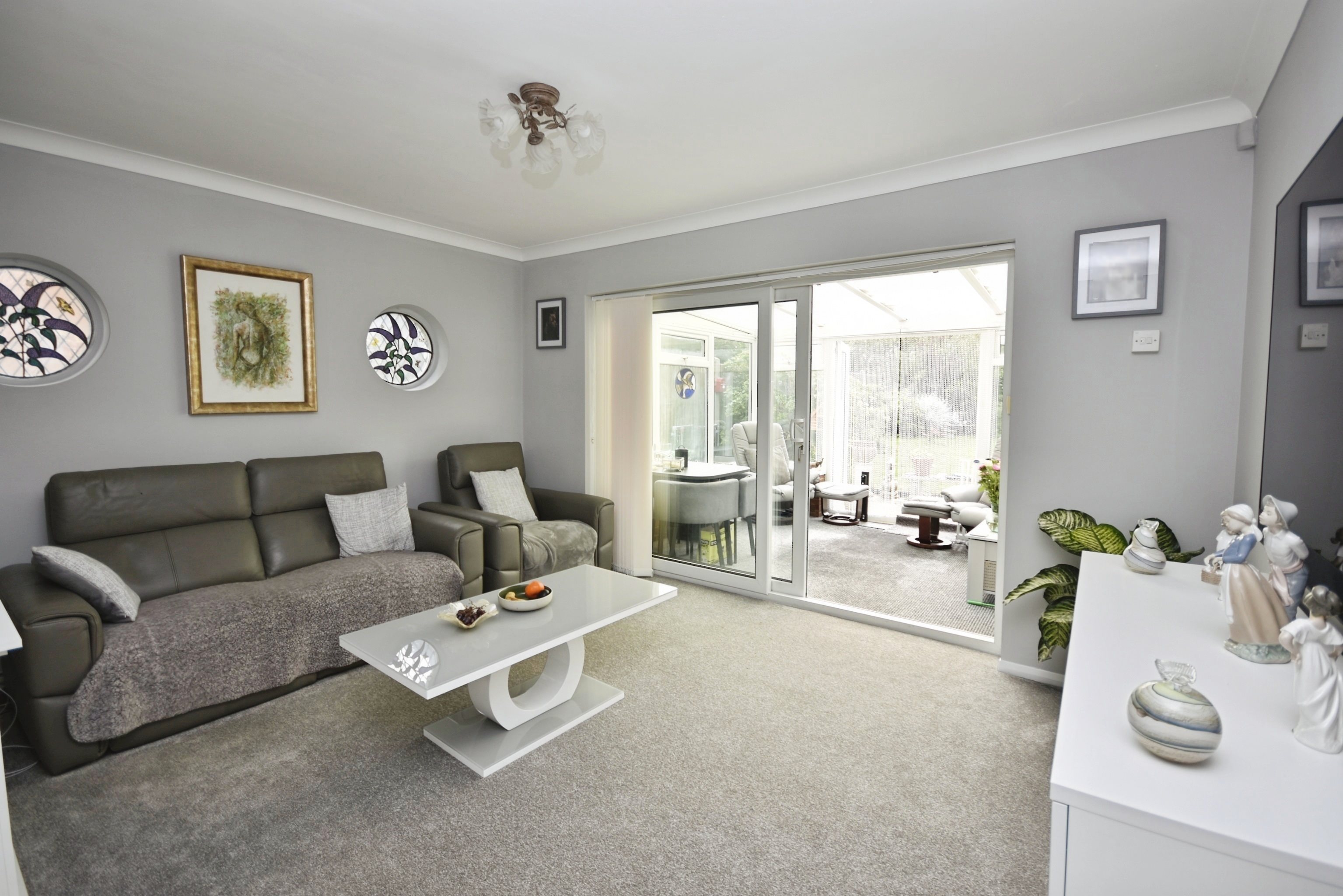Entrance HallRadiator. Power points. Loft hatch.Kitchen13'7 x 12'0 (4.14m x 3.66m)Double glazed bay window to front. Range of wall and base units with work surface. Space for fridge/freezer. Space for dishwasher. Space for washing machine with cupboard over. Space for oven. One and half bowl sink with drainer. Double glazed window to side. Radiator. Power points. Wall mounted combi boiler.LobbySpace for tumble dryer. Double door to side leading to drivewayLounge13'9 x 11'9 (4.19m x 3.58m)Two x windows to side. Electric fire place. Power points. Radiator.Conservatory11'1 x 9'5 (3.38m x 2.87m)Double glazed windows to side and rear. French doors to garden. Power points.Bedroom One11'9 x 9'9 (3.58m x 2.97m)French doors to garden. Power points. Radiator.Bedroom Two11'9 x 10'8 (3.58m x 3.25m)Double glazed window to front. Radiator. Power pointsWet Room8'3 x 5'5 (2.51m x 1.65m)Wet room style shower room with mains shower and rainfall shower. Wash hand basin inset in vanity unit. Low level WC with hidden cistern. Heated towel rail. Two x double glazed windows to side. Marble floor with under floor heating.Rear GardenMainly laid to lawn. Paved areas.Garage to SideRear access to garden. Power points.Driveway to Front