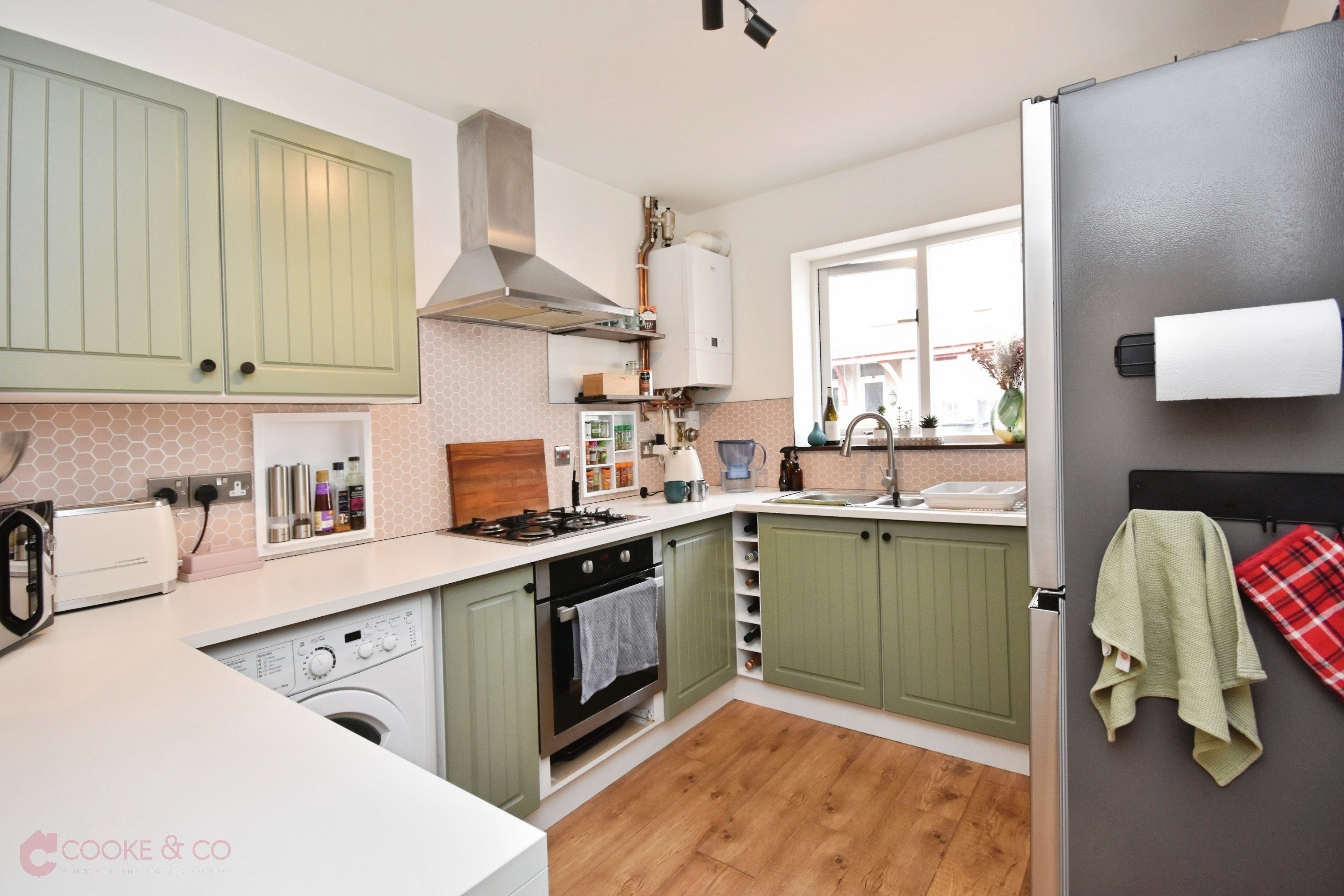 Windows to front, space for fridge/freezer, space for washing machine, integrated oven and four burner gas hob, tiled splash backs, stainless steel sink with mixers taps, extractor hood, boiler with 7 years warranty remaining, laminate flooring, radiator, power points, built in wine rack.