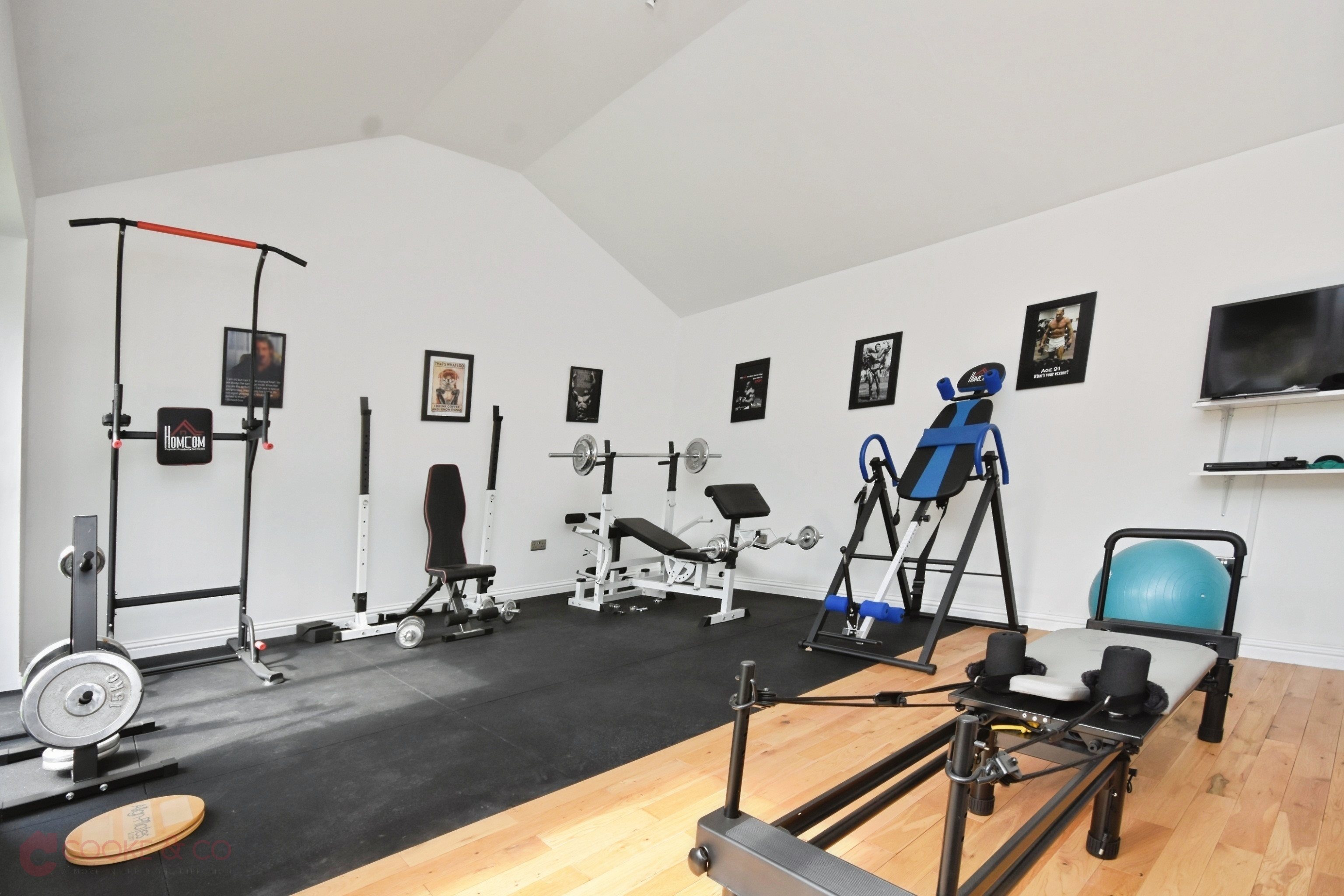 Gated Entrance Via intercom system into; Front Garden Laid to pave throughout enabling ample off road parking to the front of the property. Entrance Via front door into; Hallway 24'05 x 12'09 (7.44m x 3.89m) Tiled flooring. Radiator. Skirting. Alarm housing. Cornicing. Storage cupboard. Power points. Snug Lounge 16'02 x 11'03 (4.93m x 3.43m) Windows to front. Wooden flooring. Cornicing. Skirting. Radiator. Power points. Lounge 24'0 x 18'09 (7.32m x 5.72m) Windows to front. Wooden flooring. Skirting. Cornicing. Radiator. Power points. Dining Room 23'07 x 15'09 (7.19m x 4.8m) Bi-folding doors to rear garden. Tiled flooring. Cornicing. Skirting. Power points. Kitchen 24'06 x 15'11 (7.47m x 4.85m) Velux windows over head. French doors to rear garden. Matching array of wall and base units with complimentary granite work surfaces. AEG & Zanussi integrated appliances. Induction hob. Cornicing. Sink with mixer taps. Power points. Door with access to; Utility Room 15'01 x 14'06 (4.6m x 4.42m) Windows to side. Matching array of wall and base units with complimentary work surfaces. Space and plumbing for washing machine and tumble dryer. Power points. Skirting. Stainless steel sink with mixer taps. Door with access to rear garden. Door with integral access to garage. Downstairs Toilet 4'11 x 4'11 (1.5m x 1.5m) Velux window over head. Low level W/C. Sink with mixer taps. Stairs To First Floor Carpeted stairs leading to; Bedroom Four 11'11 x 9'06 (3.63m x 2.9m) Windows to front. Carpeted. Skirting. Radiator. Power points. En-Suite Shower Room 7'0 x 3'10 (2.13m x 1.17m) Low level W/c. Sink with mixer taps. Shower cubicle. Tiled flooring. Bedroom Three 21'11 x 5'08 (6.68m x 1.73m) Windows to front. Carpeted. Skirting. Power points. Radiator. En-Suite 11'01 x 8'08 (3.38m x 2.64m) Frosted window to rear. Shower cubicle. Low level W/C. Sink with mixer taps. Tiled flooring and walls. Bedroom Two 18'03 x 10'02 (5.56m x 3.1m) Door to rear with access to balcony. Carpeted. Power points. Radiator. Skirting. En-Suite 10'02 x 5'06 (3.1m x 1.68m) Frosted window to rear. Shower cubicle. Low level W/C. Sink with mixer taps. Tiled flooring and walls. Bedroom One 14'0 x 17'03 (4.27m x 5.26m) Door with access to balcony. Carpeted. Skirting. Power points. Radiator. Tiled flooring and walls. Walk In Wardrobe 7'03 x 5'09 (2.21m x 1.75m) Fitted wardrobes throughout. En-Suite 9'05 x 8'10 (2.87m x 2.69m) Frosted window to rear. Low level W/C. Shower cubicle. Jack and Gill sink units with mixer taps. Tiled flooring and walls. Balcony Access to balcony from bedroom one and two over looking the rear garden. Tiled throughout. Outdoor Gym Out building which currently serves purpose divided as a gym and a masseuse room. Rear Garden Stunning rear garden with laid to pave pathway, laid to pave patio area and mature shrubbery and plants and an orchard. Green house. Pond feature.
