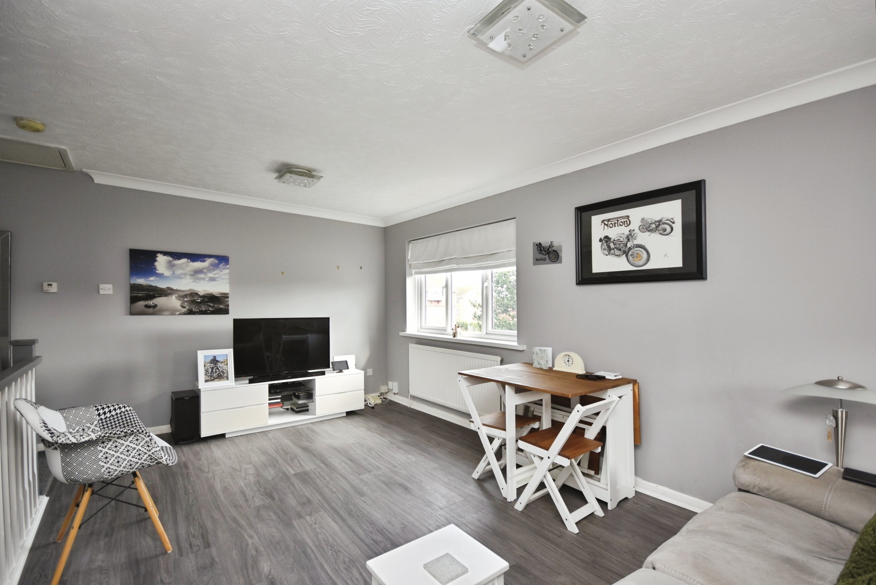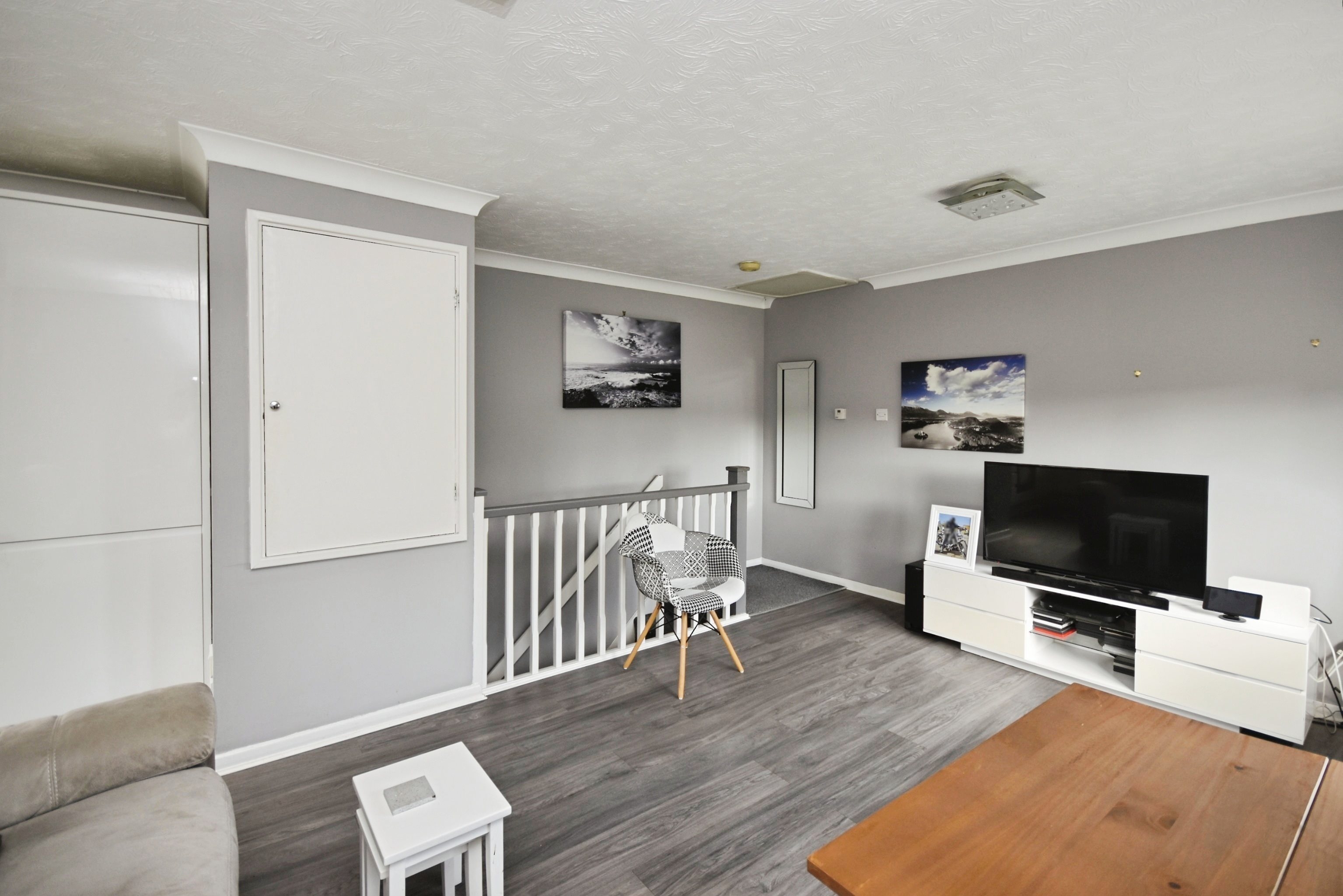 Entrance Hall Radiator. Door to.. Hallway Stairs to first floor. Cupboard with space for tumble dryer. Power points. Doors to.. Bedroom 10'9 x 10'2 (3.28m x 3.1m) Double glazed window to side. Radiator. Under stairs storage cupboard. Built in wardrobe. Power points. Shower Room 7'0 x 5'5 (2.13m x 1.65m) Shower cubicle with rainfall shower. Low level WC. Wash hand basin. Heated towel rail. Double glazed window to front. First Floor Open Plan Lounge/Kitchen/Diner 22'2 narr to 16'8 x 13'2 at widest point (6.76m narr to 5.08m x 4.01m at widest point) Lounge Area Double glazed widow to front and side. Two x Radiator. Power points. Storage cupboard. Loft hatch Kitchen Area Range of wall and base units with work surface. Integral oven and hob. Integral fridge/freezer. Integral washing machine. Sink with drainer. Power points. Double glazed window to front. Cupboard housing wall mounted boiler. Garden to Side Garage & Parking