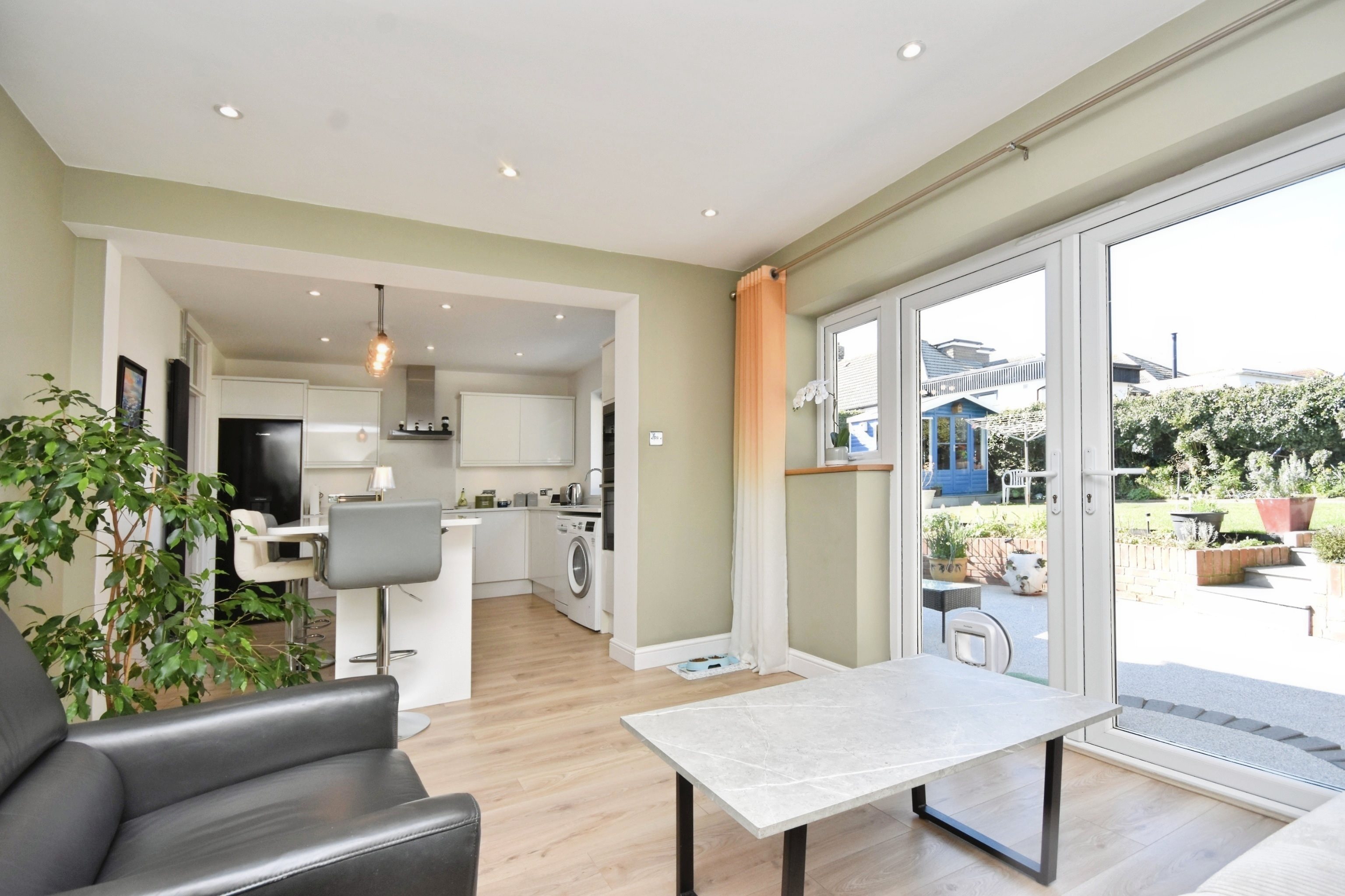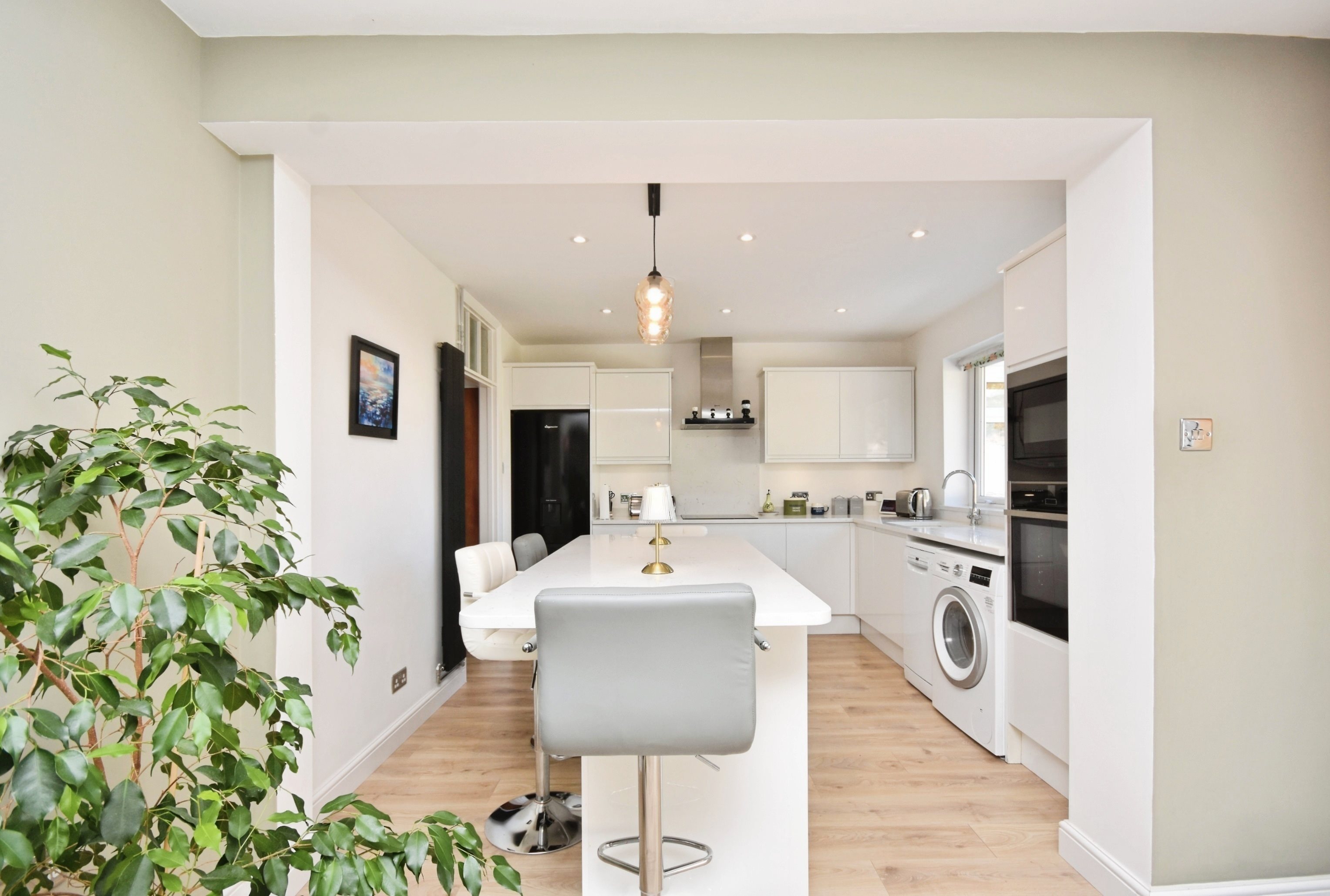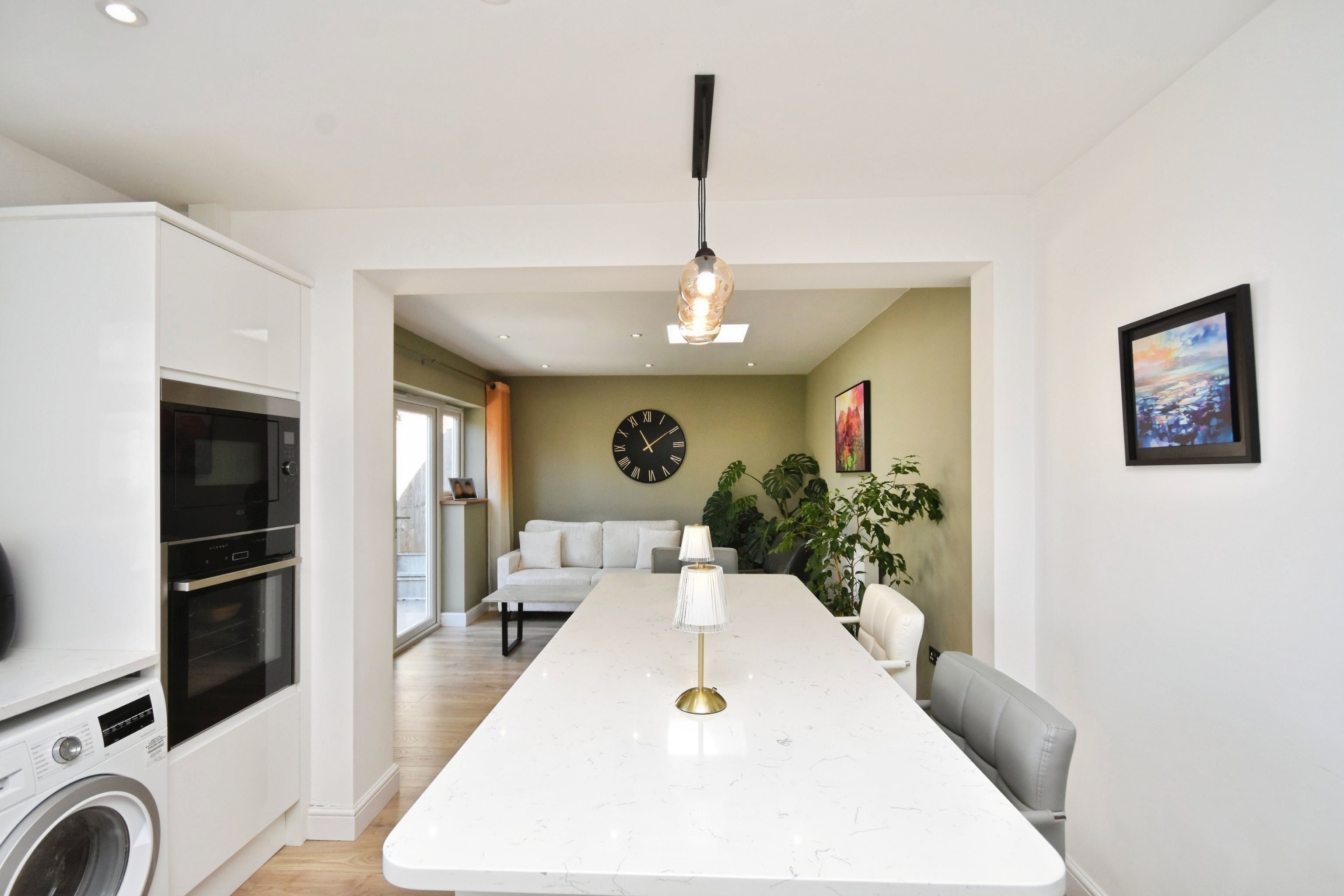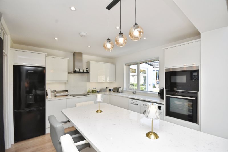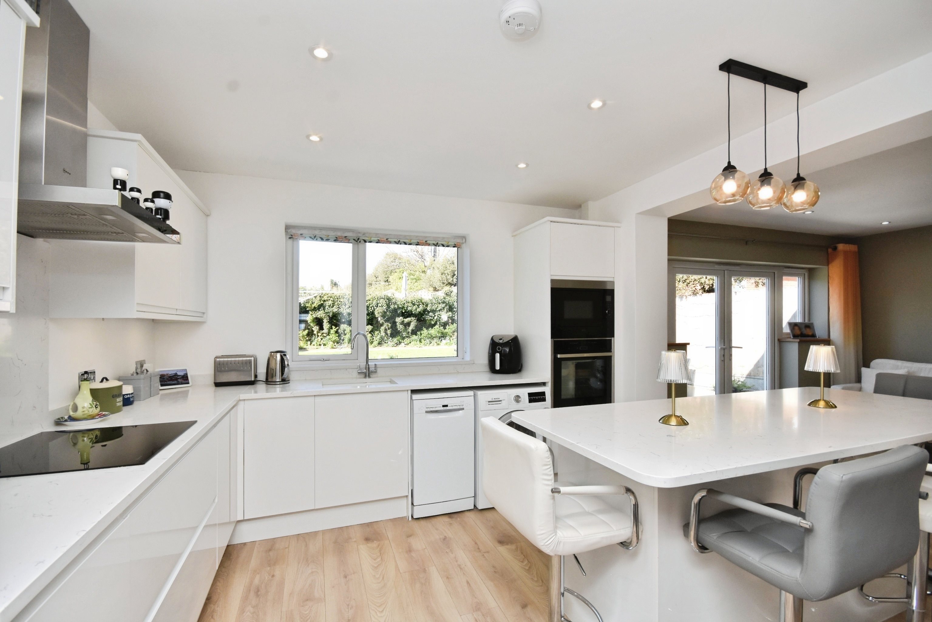 Double glazed windows to rear, sky light window over head, matching array of wall and base units with complimentary quartz work tops, integrated AEG microwave, integrated NEFF oven, space for washing machine, space for dish washer, sink with mixer taps, island seating area, space for fridge freezer, NEFF integrated four burner induction hob, NEFF extractor fan, radiator, power points, french doors to garden, power points, drop down pendant lighting.