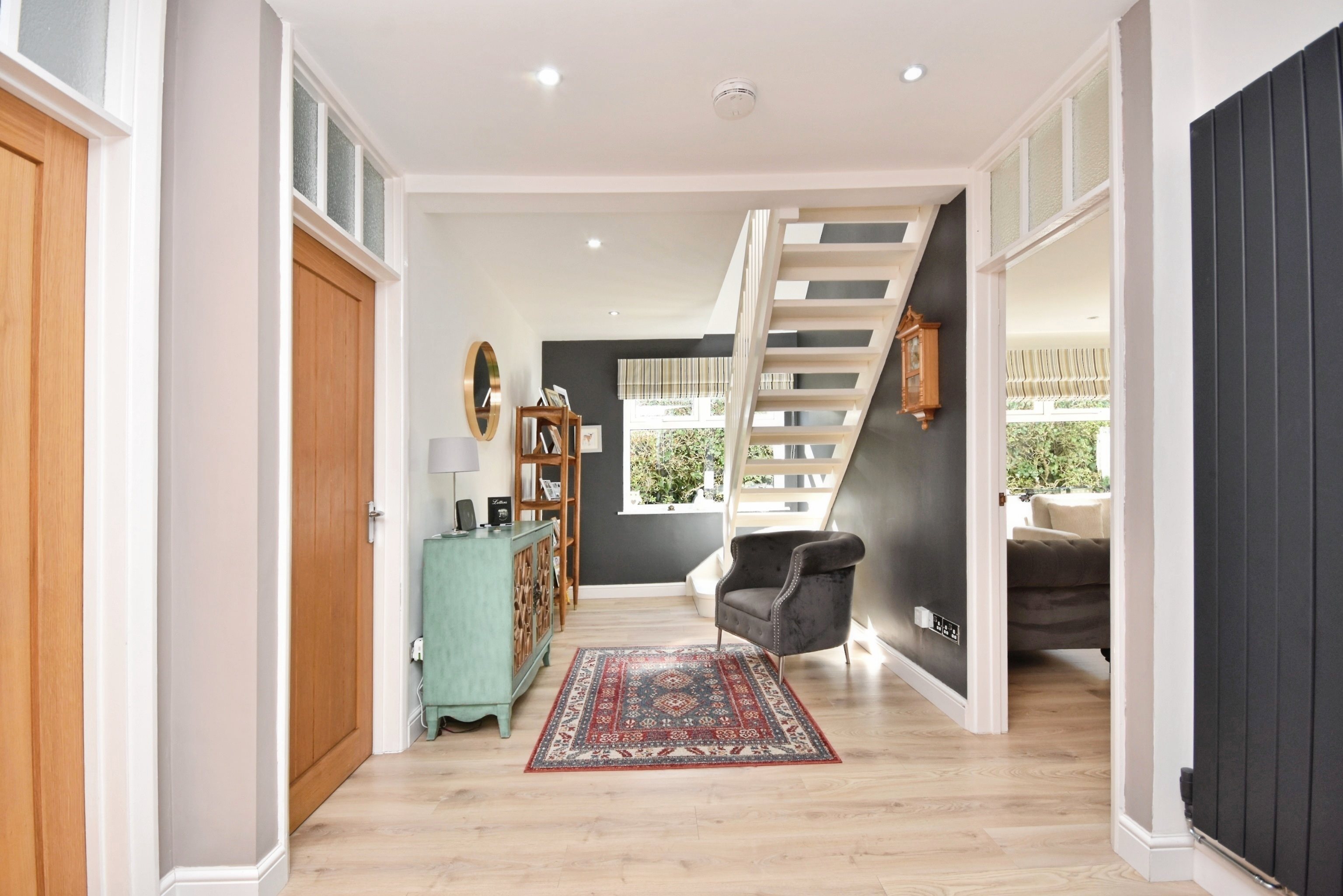 Laminate flooring, skirting, spot lighting, power points, radiators, storage cupboard.