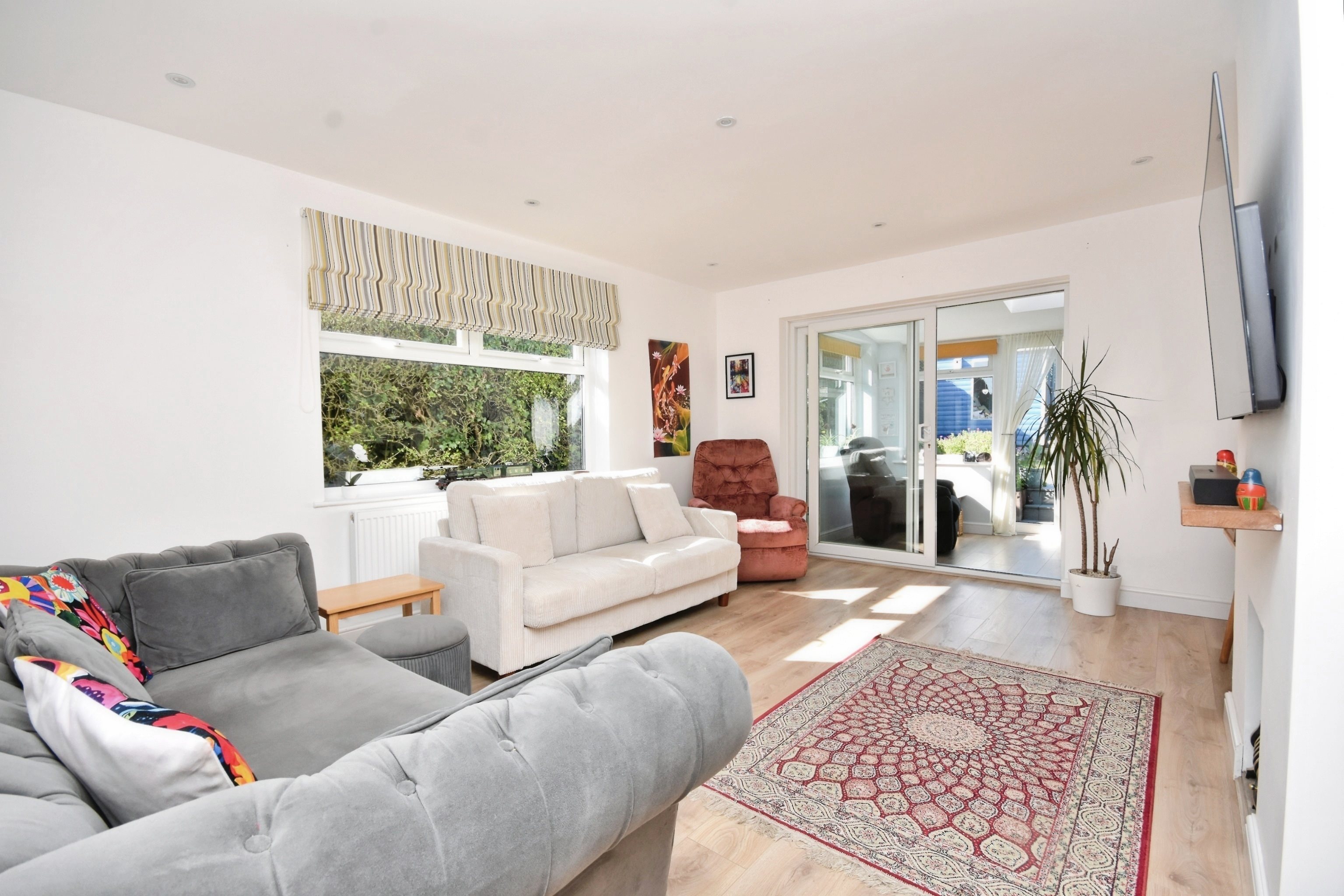 Double glazed windows to side, wooden flooring, radiator, fireplace, skirting, power points, sliding doors to conservatory.