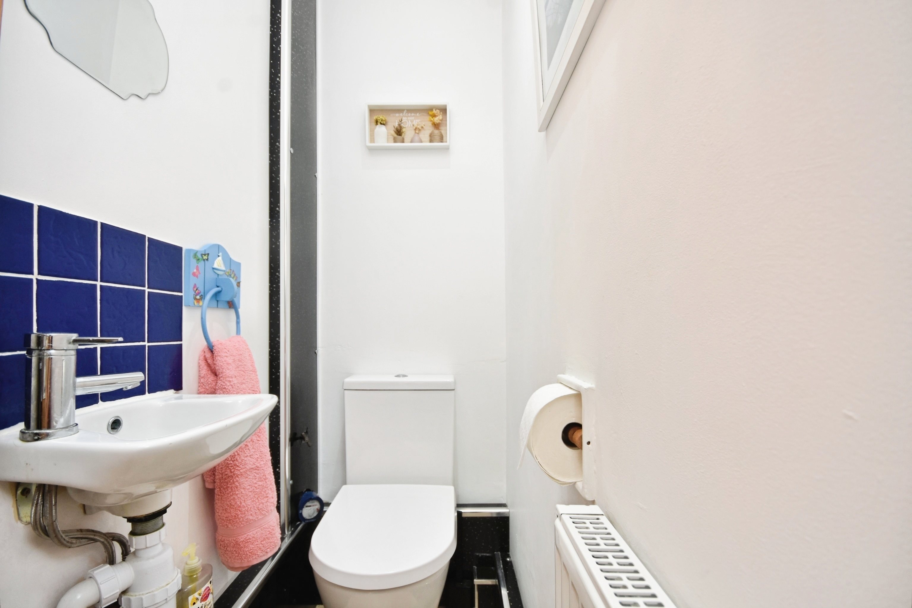 Low level w/c, radiator, tiled splash backs, sink with mixer taps.