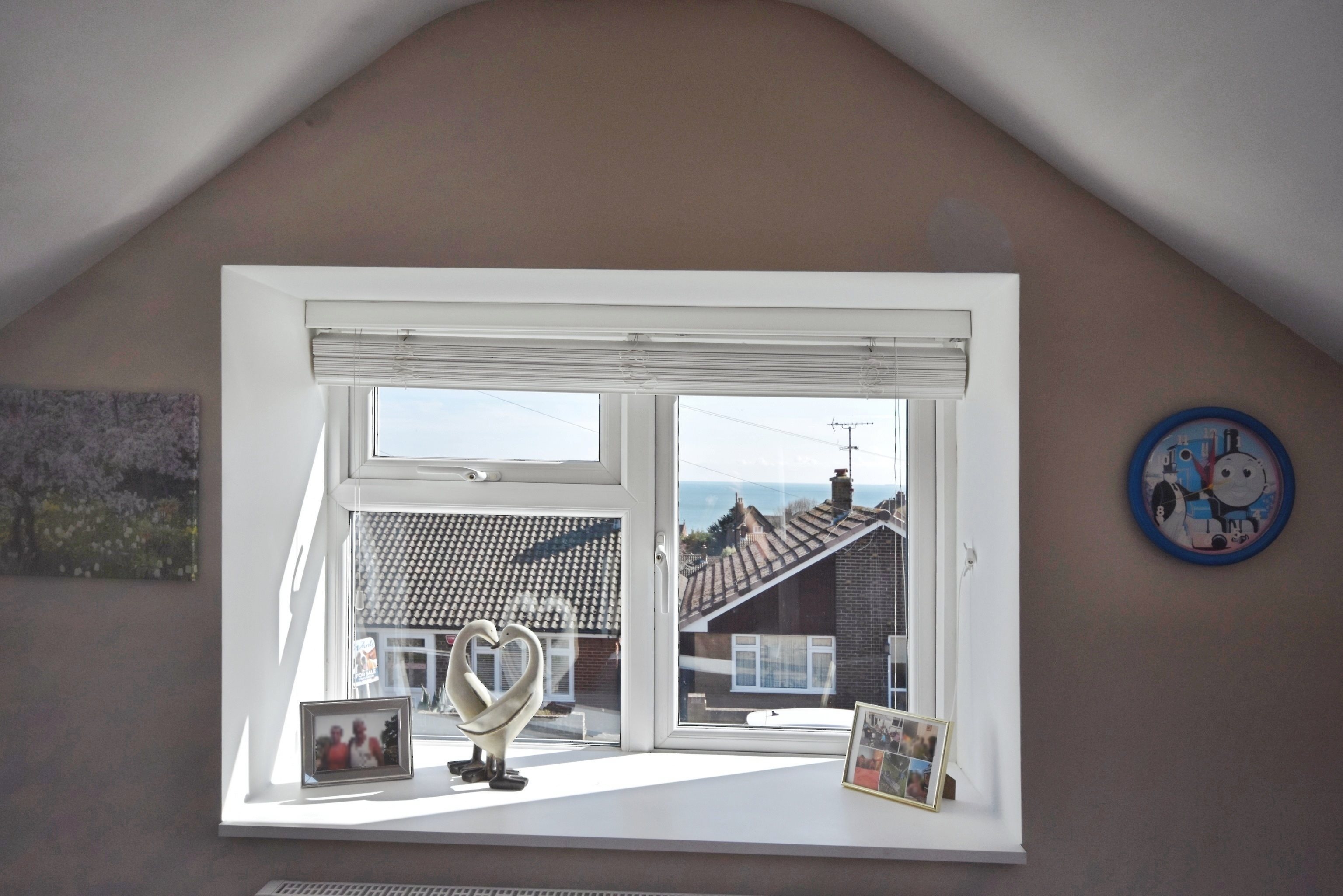 Double glazed windows to front with sea view, sky light windows to side, carpeted, under eaves storage cupboard, power points, skirting, radiator, door with access to;