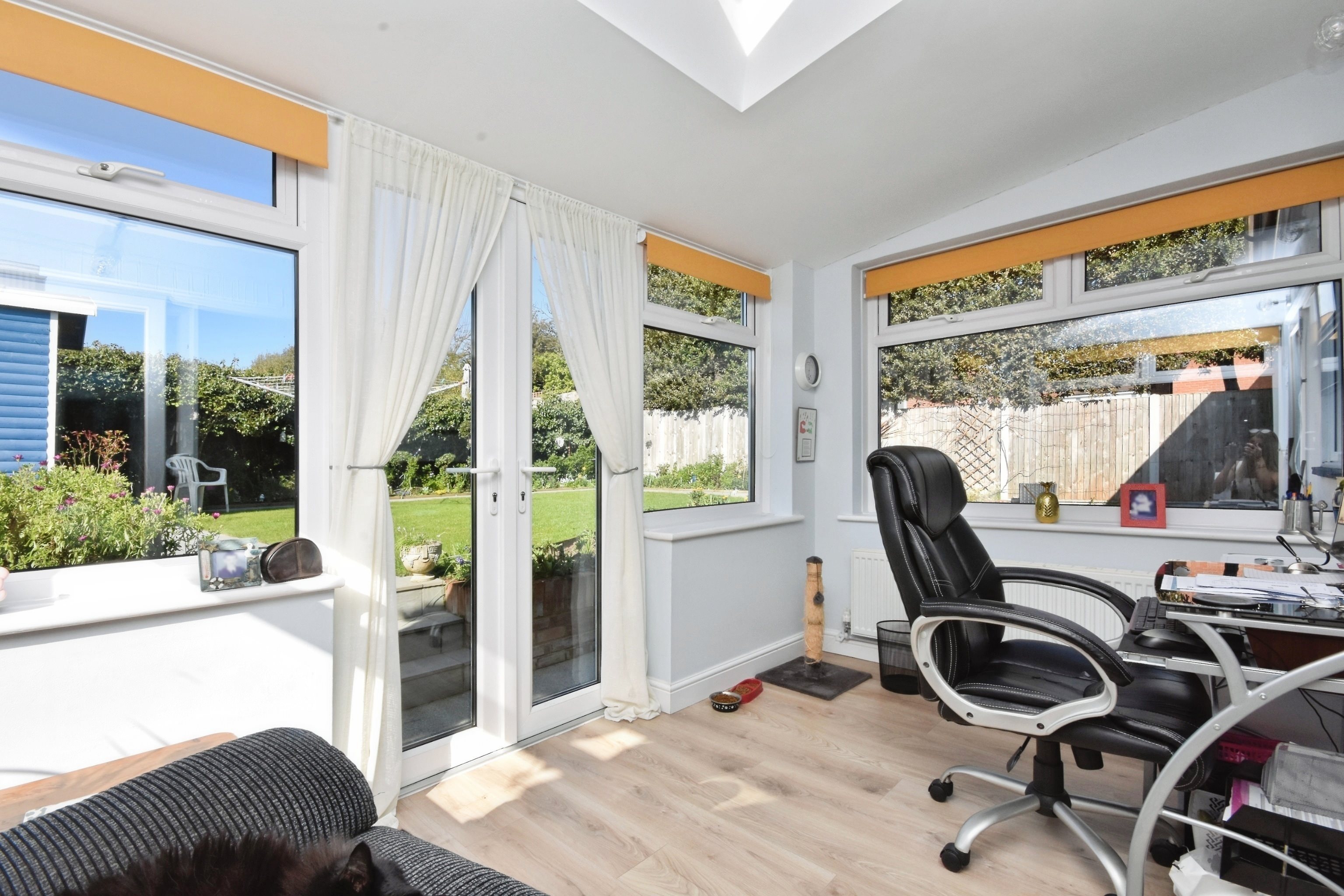Doors to rear garden, laminate flooring, skirting, double glazed windows to side and rear, radiator, power points, French doors to rear garden.