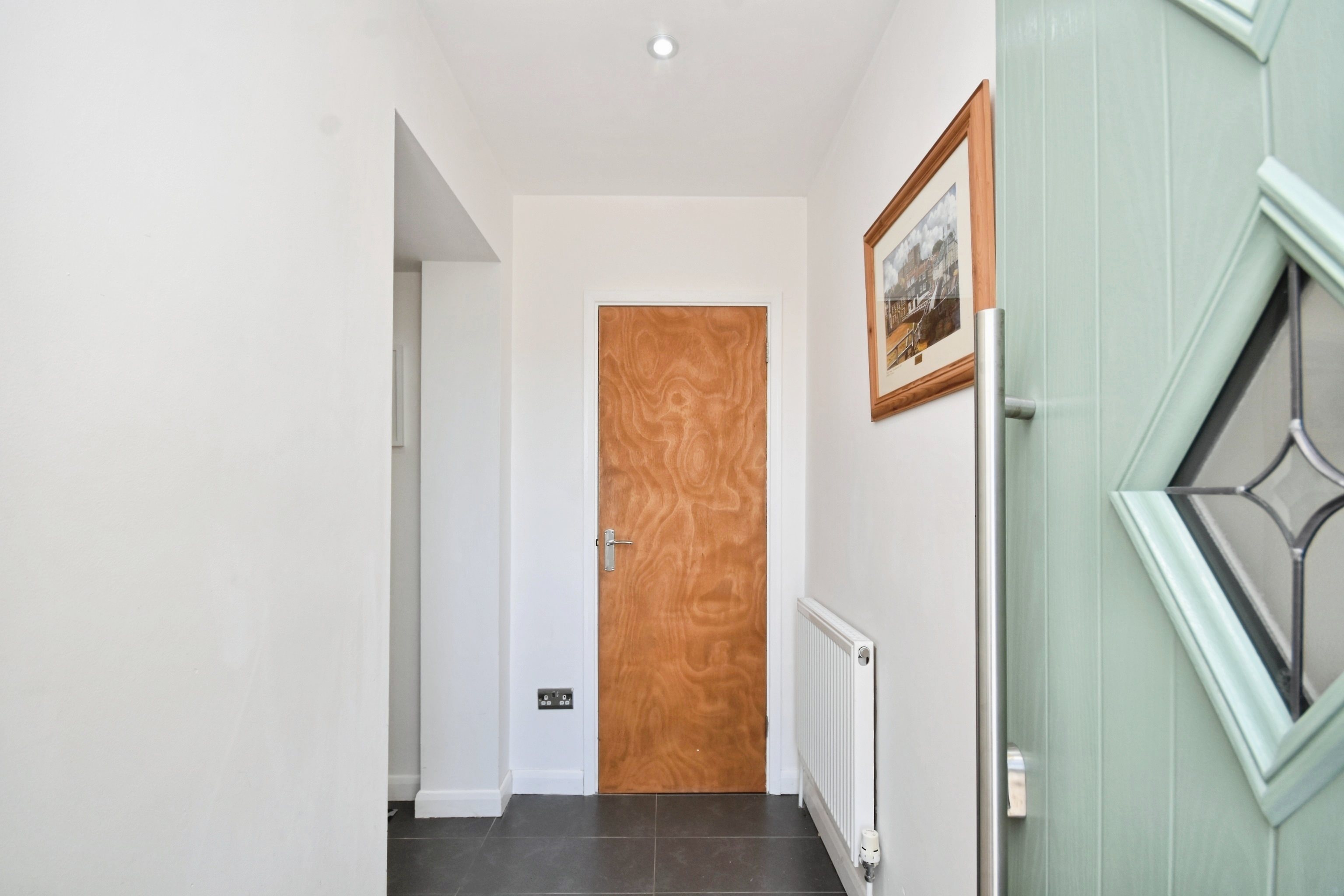 Tiled flooring, radiator, skirting, spot lighting, storage cupboards, secondary go door into-