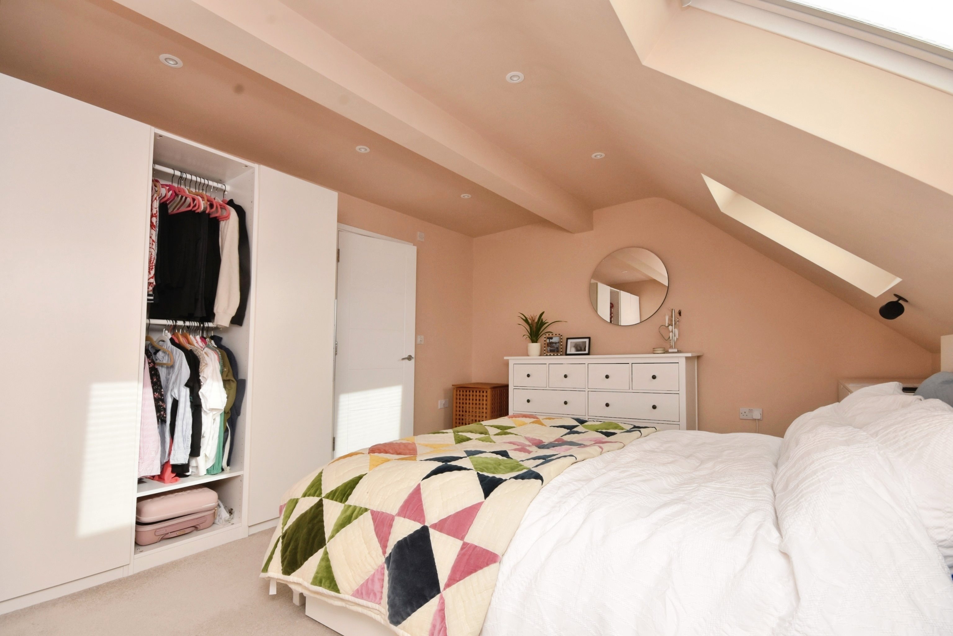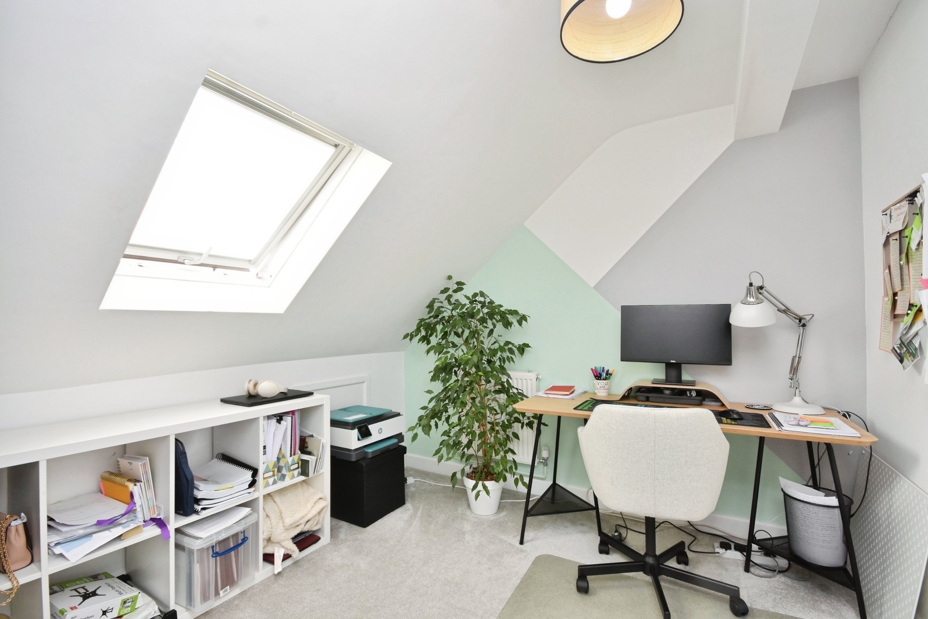 Sky light window over head, carpeted, under eaves storage cupboard, power points, radiator, skirting.