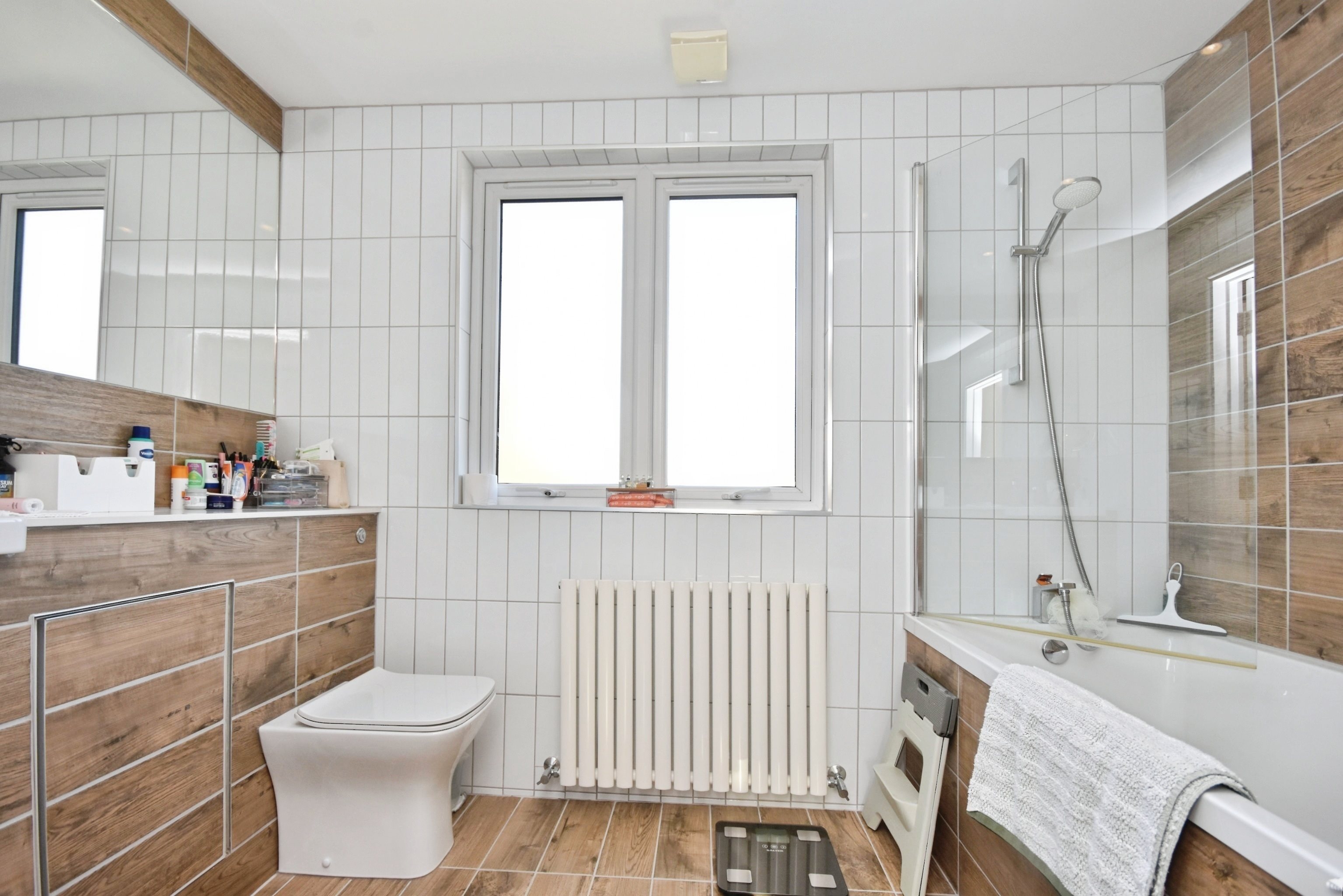 Double glazed windows frosted to rear, bath with shower attachments, low level w/c, radiator, tiled walls, sink with mixer taps.