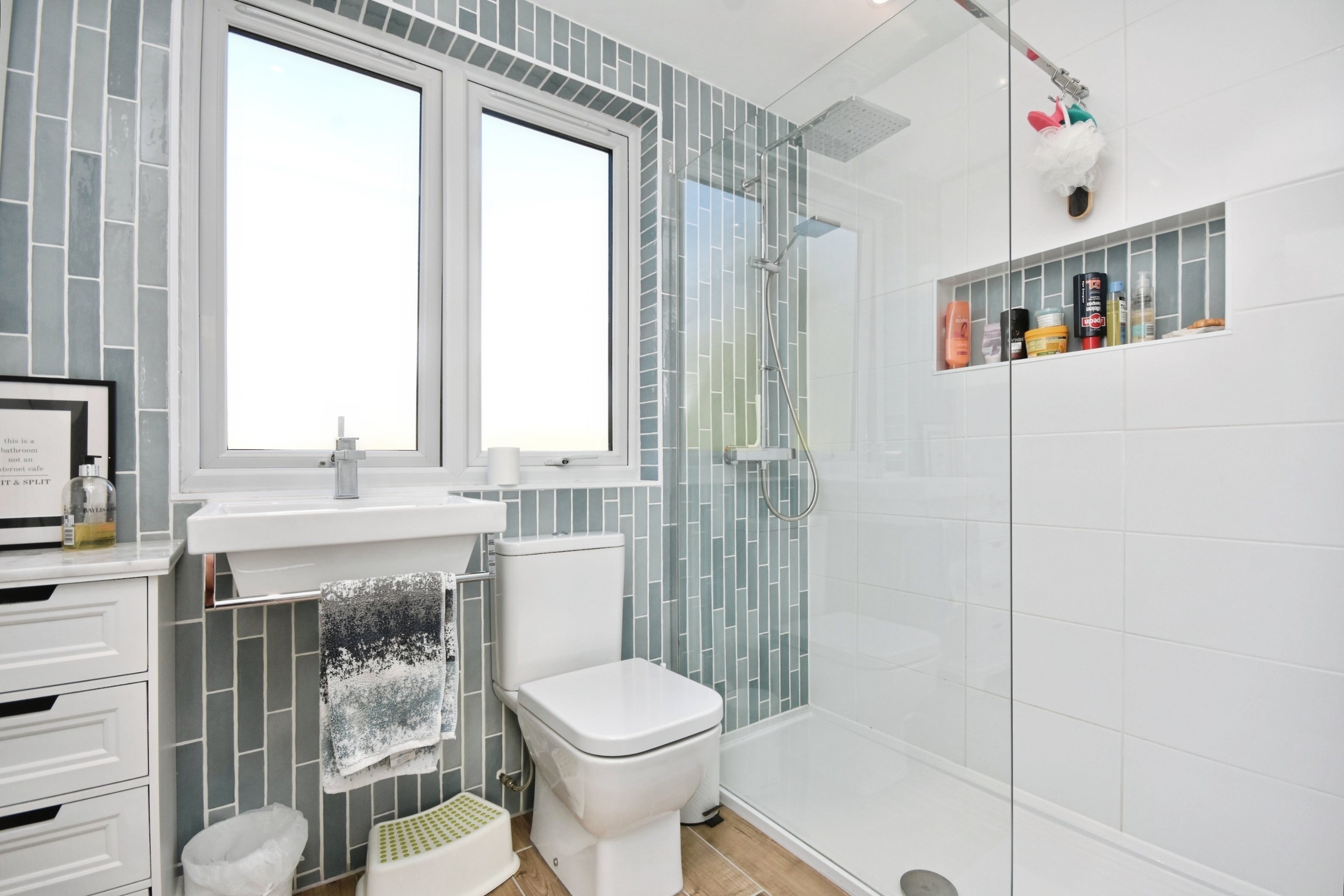 Frosted window to rear, chrome heated towel rail, water fall shower walk in, low level w/c, sink with mixer taps.