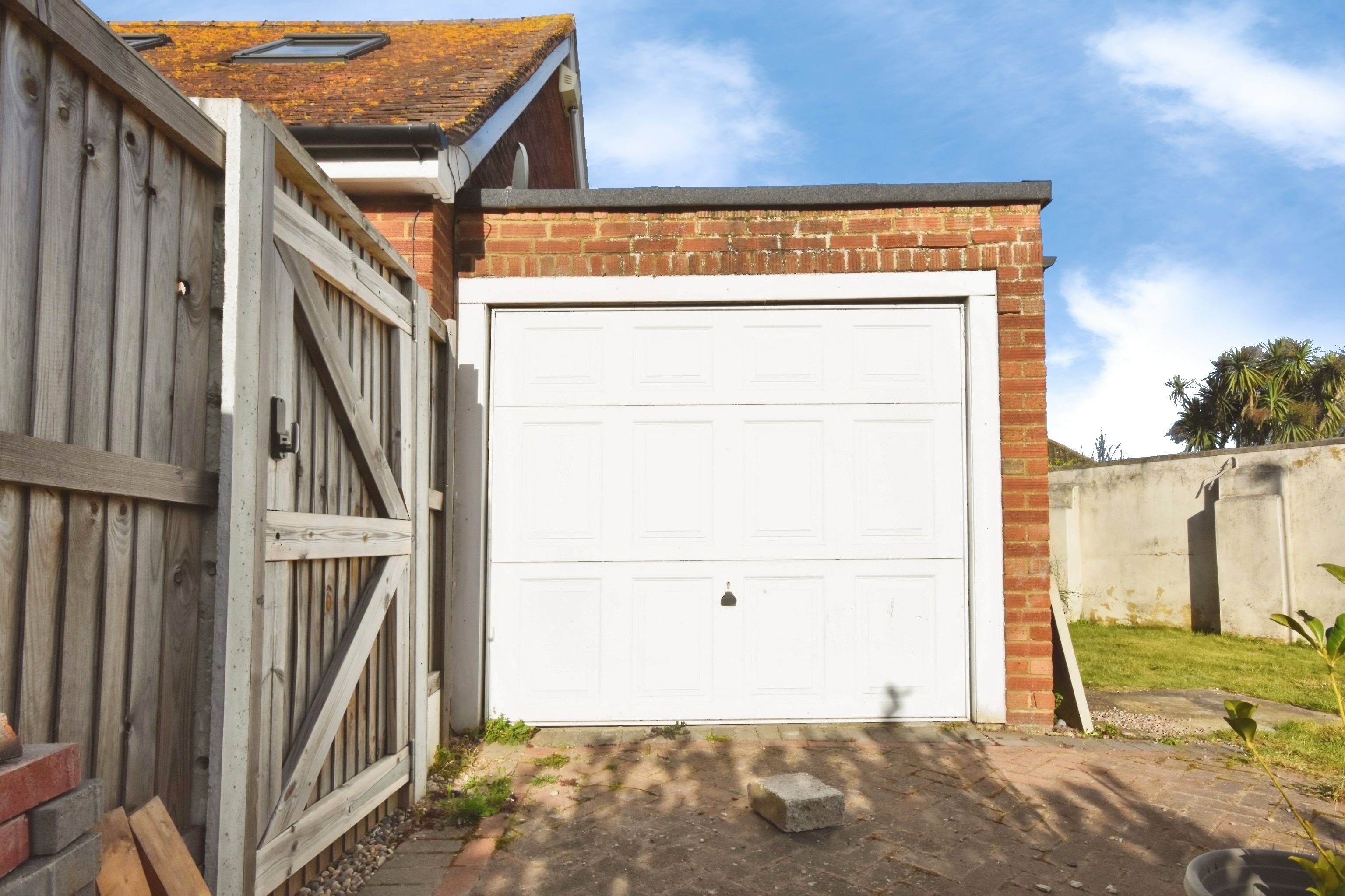 Brick driveway enabling off road parking for 2 vehicles. Wrap around side section of garden.