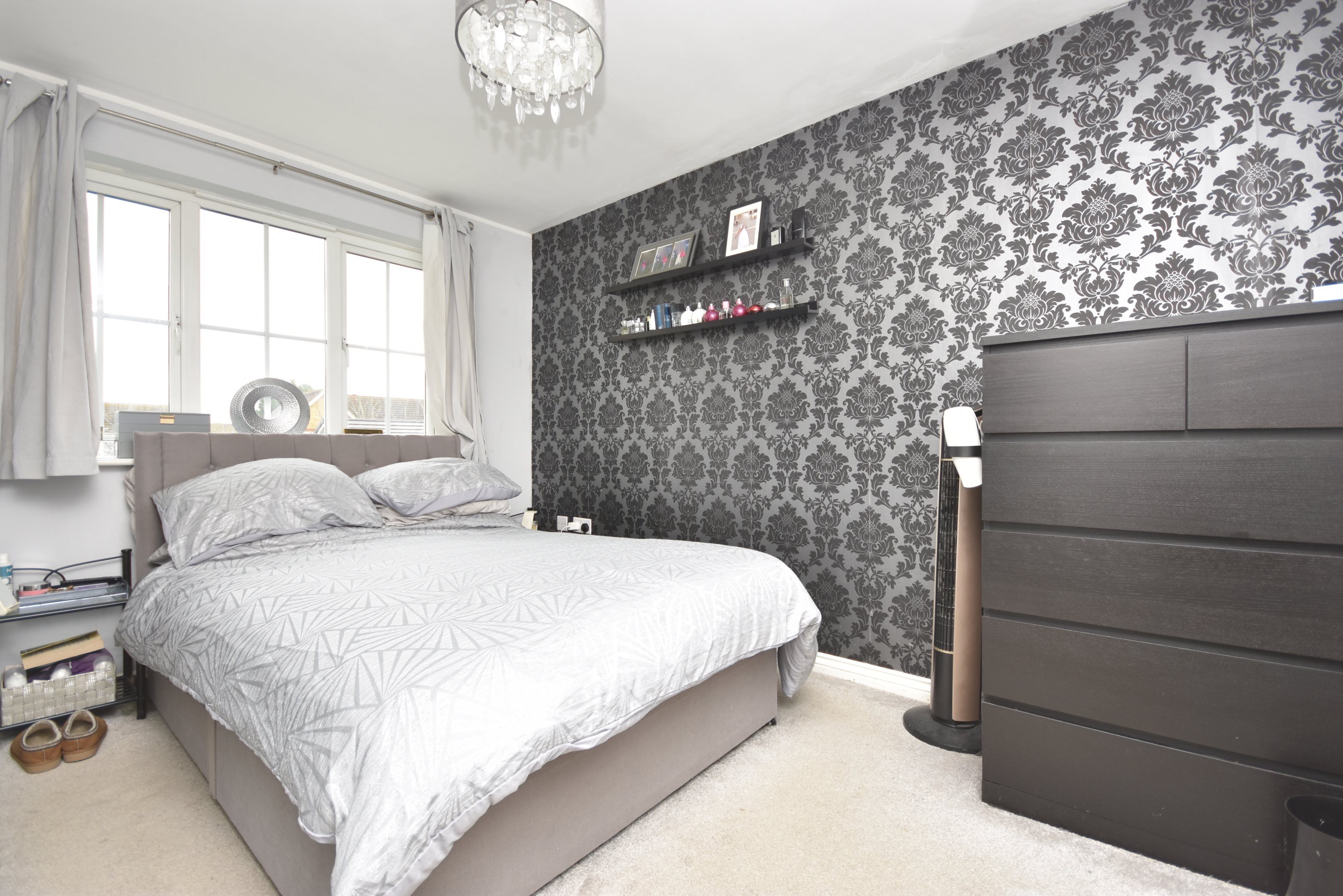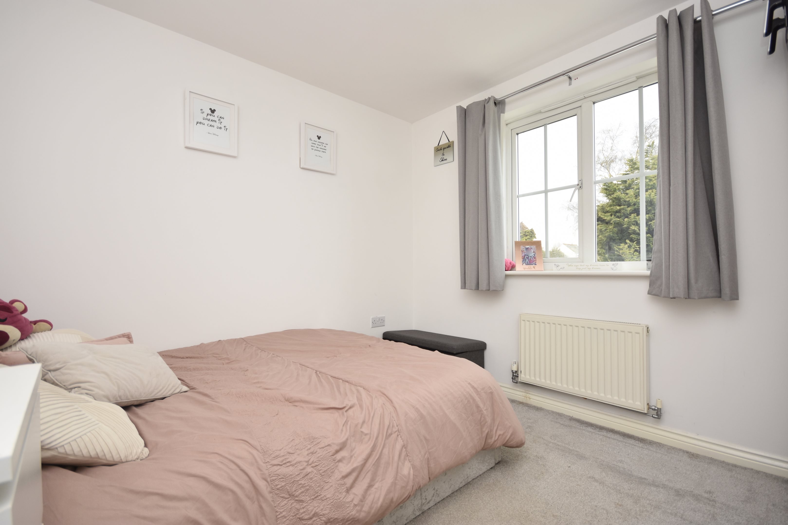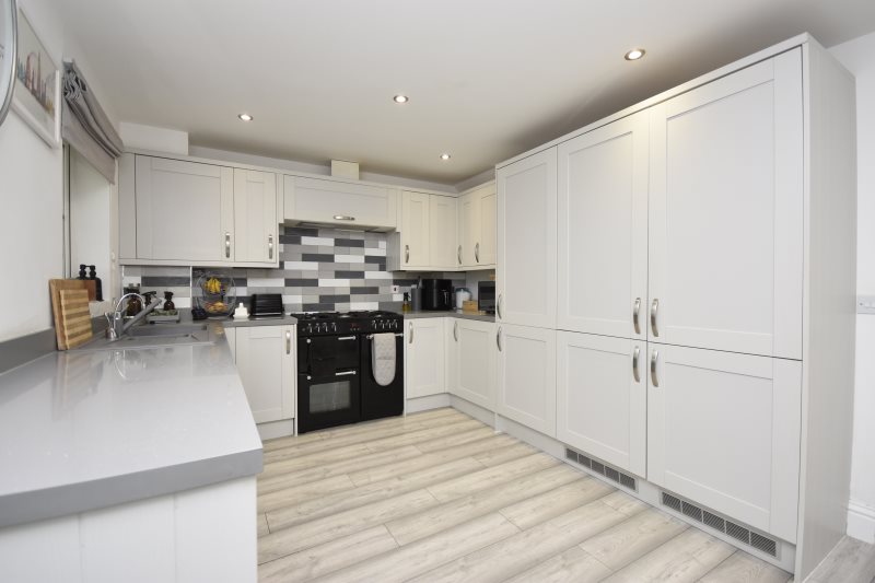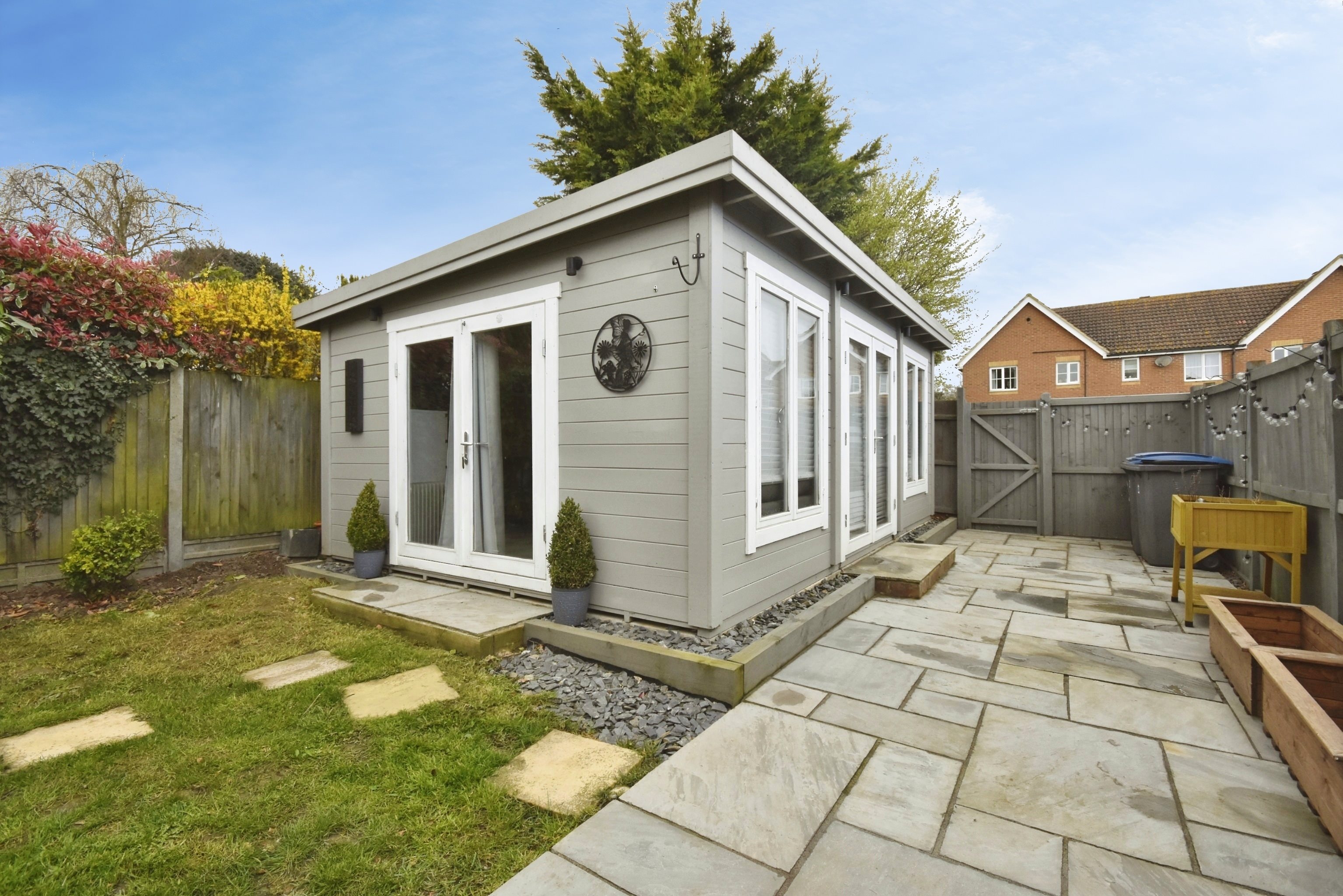 Entrance UPVC composite door into. Hallway Radiator. Stairs leading to first floor. Doors to. Cloakroom 5'7 x 2'9 (1.7m x 0.84m) Low level WC. Wash hand basin. Radiator. Double glazed frosted window to front. Lounge 14'6 x 13'3 (4.42m x 4.04m) Double glazed window to front. Radiator. Power points. Understairs storage cupboard. Kitchen / Diner 16'5 x 10'1 (5m x 3.07m) Matching wall and base units with complementary work surface. Inset acrylic sink and drainer with mixer tap and instant boiling hot water tap. Integrated full-length fridge and freezer. Integrated dishwasher. Integrated bins. Integrated washing machine. Space for tumble dryer. Space for cooker with extractor over. Breakfast bar. Radiator. Double glazed window to rear. Double glazed French doors leading to. Conservatory 17' x 10'4 (5.18m x 3.15m) Windows to rear and sides. Power points. Double glazed doors to side leading to the garden. First Floor Landing Access to loft, partially boarded. Cupboard housing boiler (approximately five years old). Doors to. Bedroom 11'7 x 10'4 (3.53m x 3.15m) Double glazed window to rear. Radiator. Power points. Door to. En-Suite 6'2 x 3'8 (1.88m x 1.12m) Shower cubicle with mains rainfall shower over. Low-level WC. Hand basin. Heated towel rail. Extractor fan. Double glazed frosted window to side. Bedroom 9'5’ x 9'2 (2.87m’ x 2.79m) Double glazed window to rear. Radiator. Power points. Bedroom 9'4 x 6'5 (2.84m x 1.96m) Double glazed window to front. Power points. Radiator. Bathroom 6'6 x 5'9 (1.98m x 1.75m) Panelled bath with shower. Low level WC. Wash hand basin. Heated towel rail. Extractor fan. Double glazed frosted window to rear. Cabin 19'5 x 13'2 (5.92m x 4.01m) Power points. Double glazed windows to side. French doors to front and side. Wi-Fi. Rear Garden Mainly laid to law. Patio area. Rear access. Leading to. Parking Hard standing offering residents parking. Communal Front Garden Mainly laid to lawn. Estate Charge The sellers have advised that there is an estate charge of approximately £20-£30 PCM.