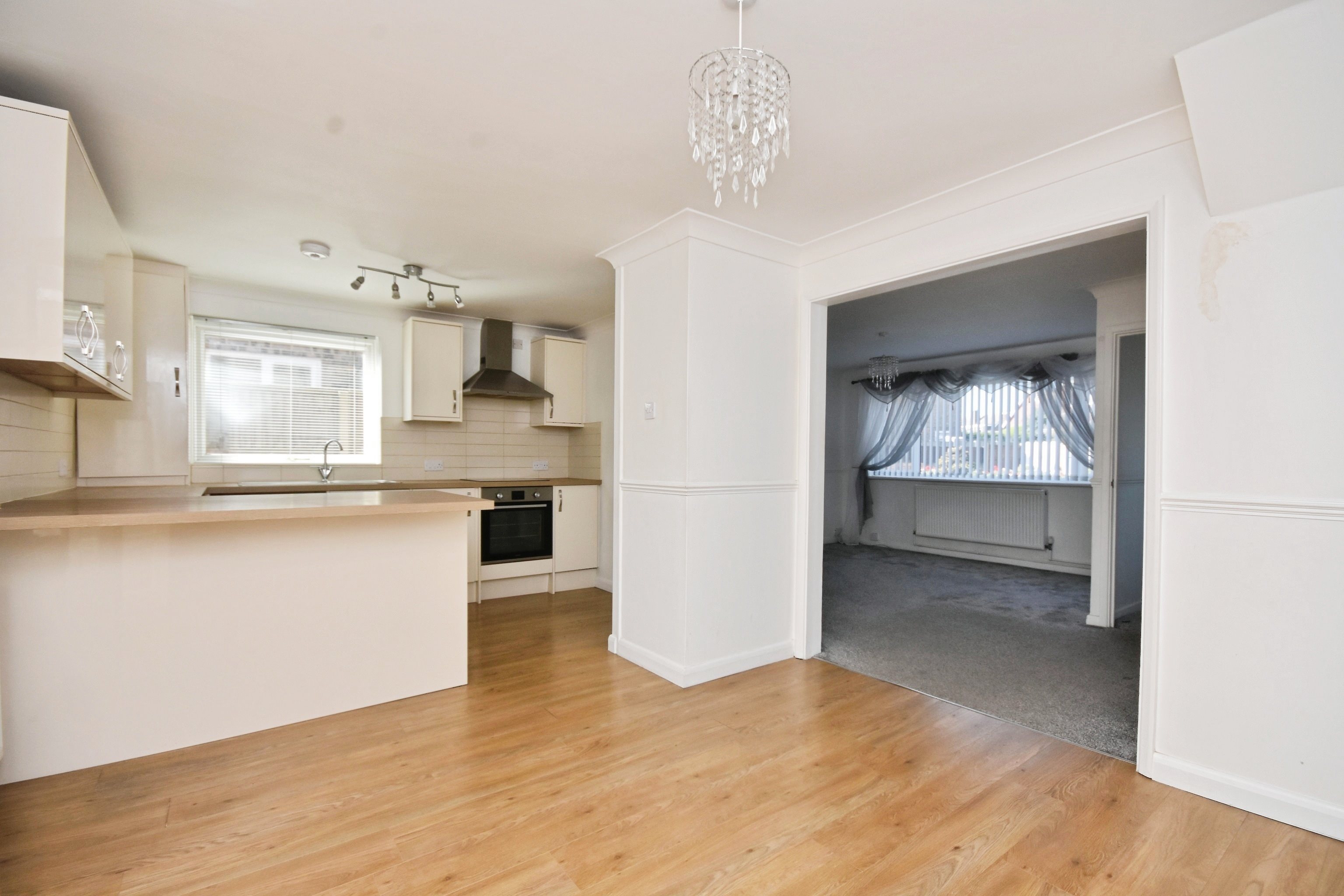 Entrance Via front door into; Hallway Carpeted, radiator, skirting. Lounge 14'11 x 13'03 (4.55m x 4.04m) Windows to side, carpeted, gas fire, tv point, skirting and coving, power points, dado rails, radiator. Kitchen/Diner 18'0 x 11'01 (5.49m x 3.38m) Windows to side, matching array of wall and base units with complimentary work surfaces, integrated oven, four burner induction hob, extractor hood, tiled splash backs, boiler, space and plumbing for washing machine, space for fridge freezer, oak flooring, power points, radiator, doors with access to- Conservatory 13'10 x 10'07 (4.22m x 3.23m) Windows to side and front, laminate flooring, doors to rear garden, radiators, power points. Stairs To First Floor Carpeted stairs leading to; Bathroom 6'07 x 4'07 (2.01m x 1.4m) Frosted window to rear, tiled walls, laminate flooring, bath with shower attachments, sink with mixer taps, coving, heated towel rail. Separate Toilet 6'03 x 2'06 (1.9m x 0.76m) Frosted window to rear, laminate flooring, low level w/c, tiled splash backs. Bedroom Two 11'07 x 10'04 (3.53m x 3.15m) Windows to rear, carpeted, skirting and coving, power points, radiator. Bedroom One 12'09 x 10'10 (3.89m x 3.3m) Window to front, carpeted, built in sliding wardrobes mirrored, radiator, power points, coving, storage cupboard. Bedroom Three 9'05 x 7'0 (2.87m x 2.13m) Window to front, carpeted, storage cupboard, radiator, power points. Front Garden Corner plot, laid to lawn Rear Garden Part shingle, part laid to lawn, side access via gate. Driveway & Garage Concrete drive way to enable off road parking for one vehicle. Up and over garage door.