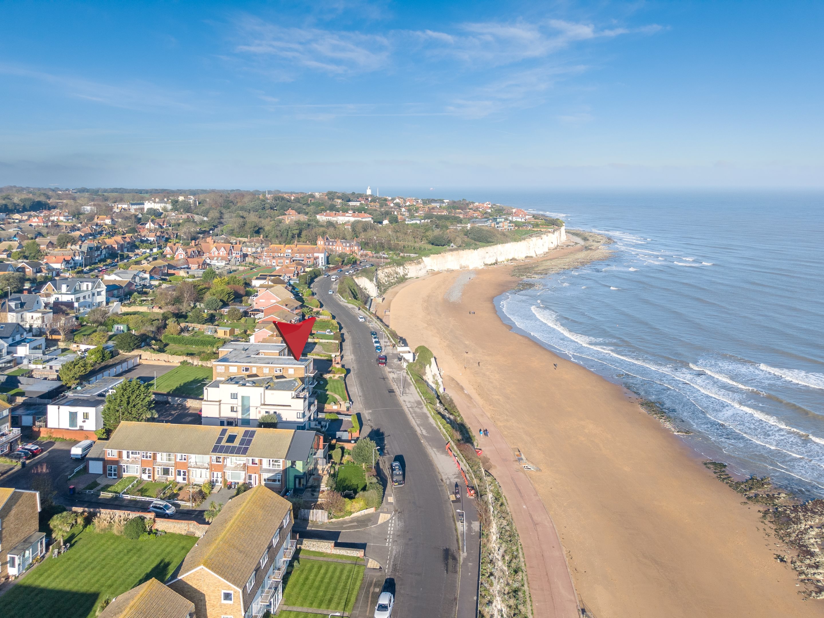 Access via bi-folding doors with panoramic sea views over Stone Bay beach.