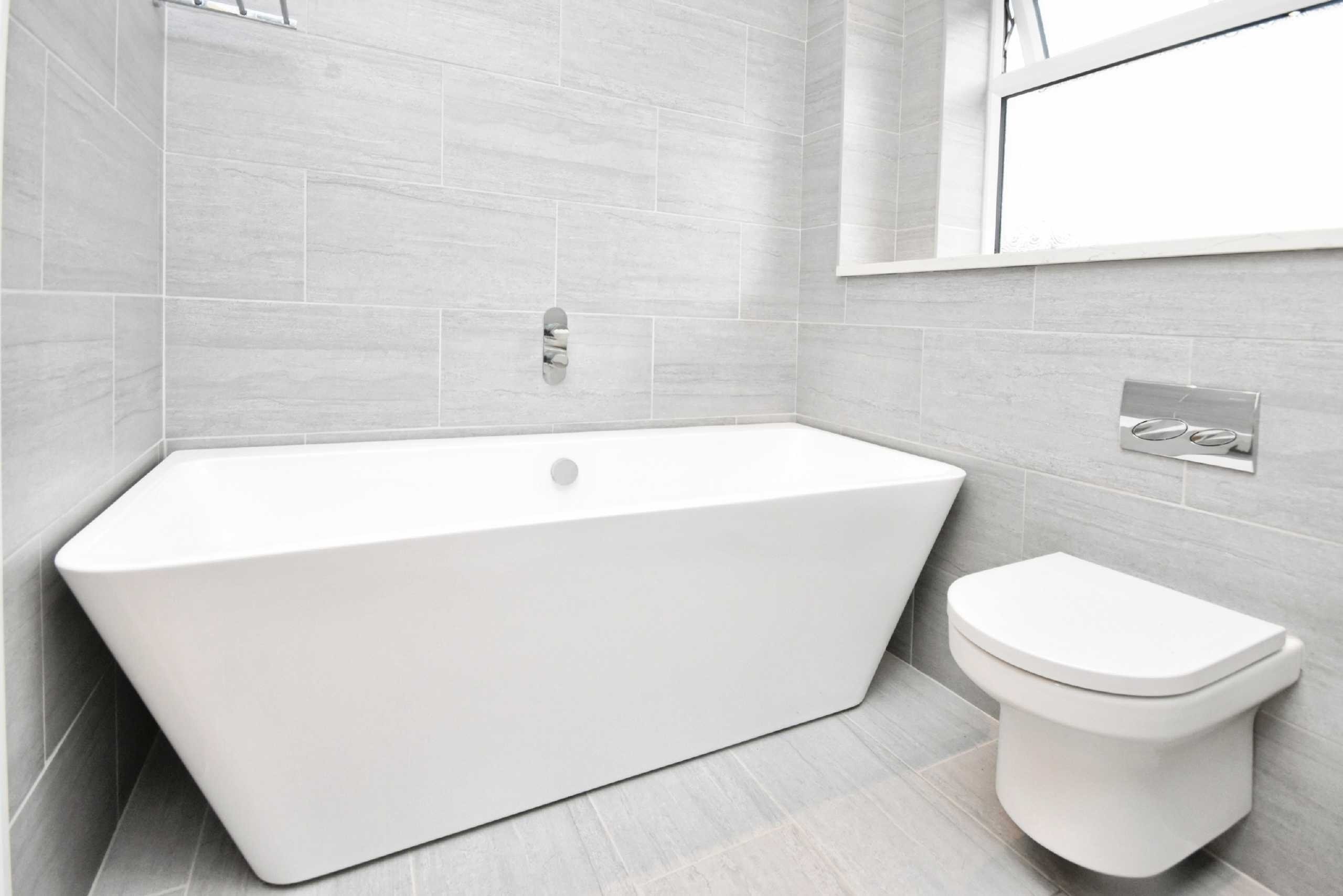Window frosted to side, tiled flooring and walls, shower cubicle, sink with mixer tap and storage, low level W/C, bath with mixer tap, heated chrome towel rail.