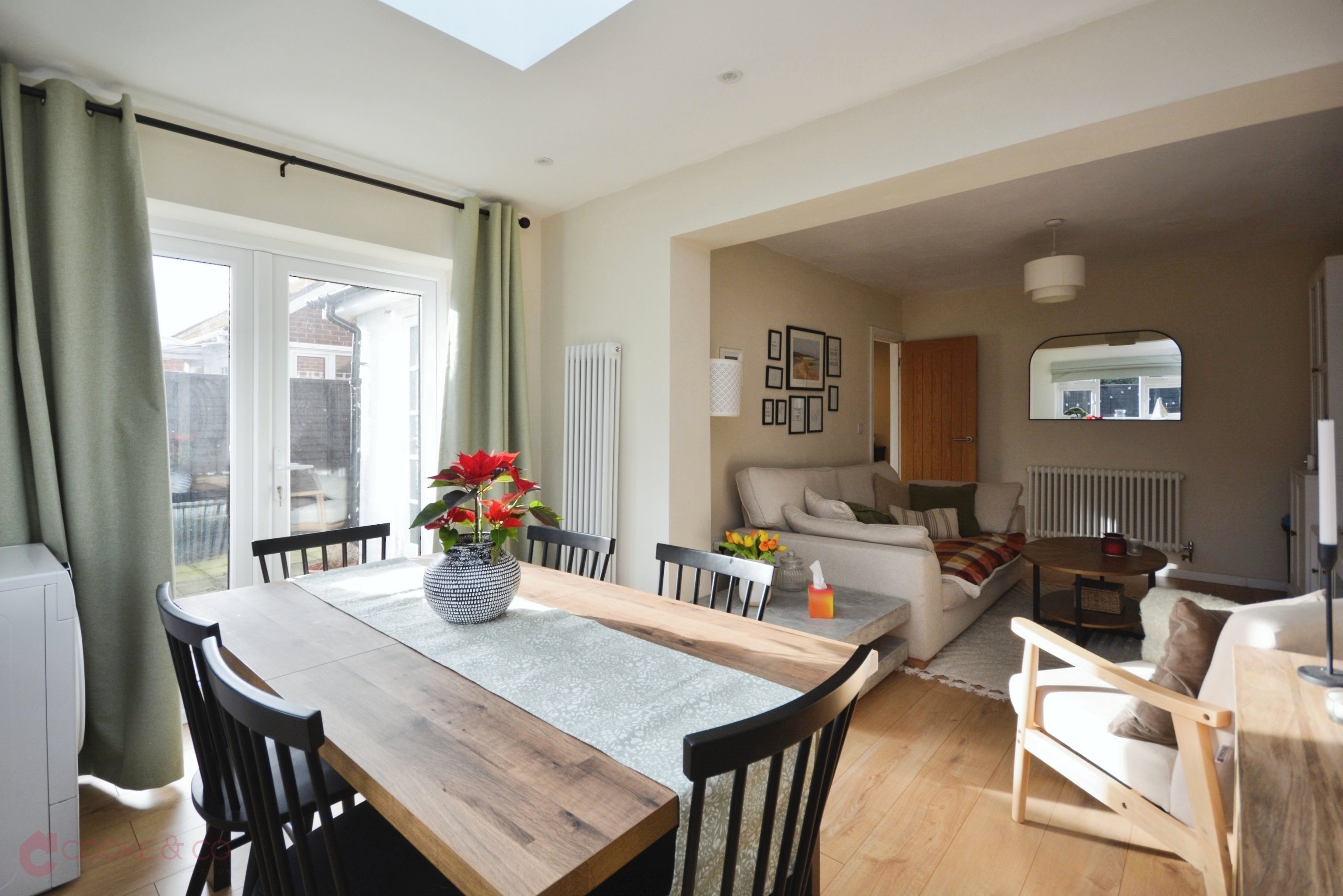 EntranceVia UPVC door into;HallwayLaminate wooden flooring. Skirting. Radiator. Power points,Bedroom11'07 x 8'08 (3.53m x 2.64m)Double glazed windows to front. Laminate wooden flooring. Skirting. Radiator. Power points,Bedroom14'11 x 10'04 (4.55m x 3.15m)Double glazed windows to front. Carpeted. Skirting. Radiator. Power points.Shower Room6'01 x 5'06 (1.85m x 1.68m)Frosted double glazed window to side. Low level W/C. Shower cubicle. Sink with mixer taps and built in storage cupboard. LED touch screen vanity mirror. Heated chrome towel rail. Tiled flooring. Tiled splash backs.Lounge/Diner21'06 x 11'09 (6.55m x 3.58m)Double glazed windows to rear. Sky light over head. Laminate wooden flooring. TV point. Skirting. Power points. Radiator. Skirting. Door with access to rear garden.Kitchen9'05 x 8'09 (2.87m x 2.67m)Double glazed windows to side. Matching array of wall and base units with complimentary work surfaces. Integrated oven. Four burner gas hob. Space and plumbing for washing machine. Space for fridge/freezer. Sink with mixer taps. Extractor fan. Storage cupboard which houses the boiler. Tiled splash backs.Front GardenPart laid to lawn with mature shrubbery. Off road parking via the driveway for two vehicles.Rear GardenPart shingle. Part concrete. Gate with side access. Ideal for hosting friends and family.