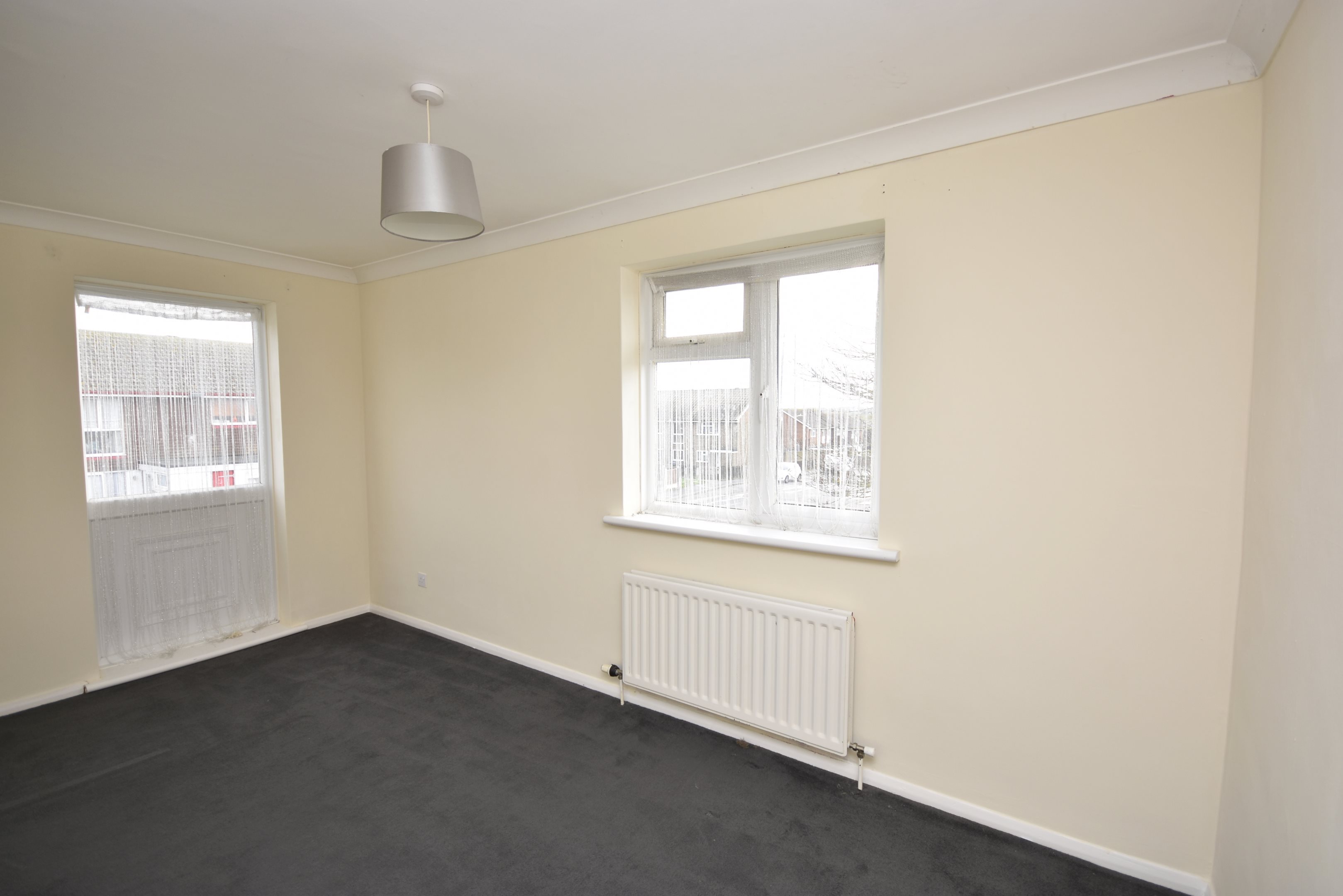 Large cupboard with windows into hallway and lounge 6'8 x 2'9L Shaped Lounge/Diner17'5 x 9'7 narr to 14'6 (5.31m x 2.92m narr to 4.42m)Radiator x two. Power points. Double glazed window to rear. Double glazed doors to garden.Kitchen9'9 x 8'9 narr to 6'9 (2.97m x 2.67m narr to 2.06m)Double glazed window to front. Radiator. Range of wall and base units. Space for fridge/freezer space for oven. Sink with drainer. Space for washing machine.LandingDouble glazed to side. Storage cupboard x two. Power point. Radiator. Loft hatch.Bedroom One14'5 x 8'5 (4.39m x 2.57m)Two x double glazed windows to rear. Radiator. Power points.Bedroom Two14'5 x 10'8 narr to 6'9 (4.39m x 3.25m narr to 2.06m)Double glazed windows to front and side. Radiator. Power points.Bathroom7'7 x 7'6 (2.31m x 2.29m)Panelled bath with shower over top. Low level WC. Wash hand basin. Radiator.GardenLawned area. Patio path leading to door to garage. Outside Tap to front.Garage & Parking