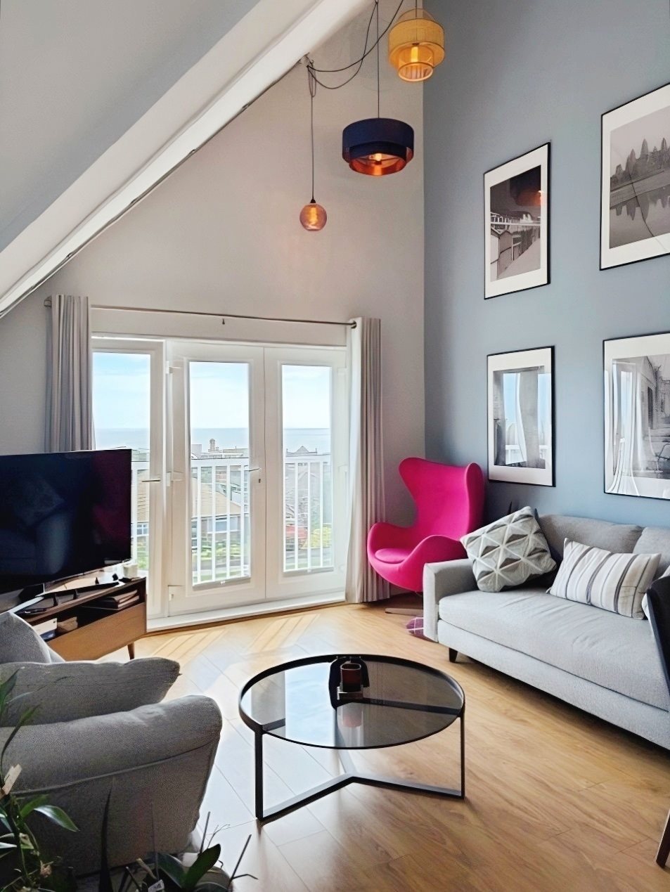 Spanning two bright and spacious floors, the apartment is immaculately presented throughout. At its heart is a vaulted open-plan kitchen/lounge/diner, complete with a water softening system and filtered drinking water unit. A south-facing Juliette balcony frames stunning sea views on a clear day, you can even catch a glimpse of the French coastline.