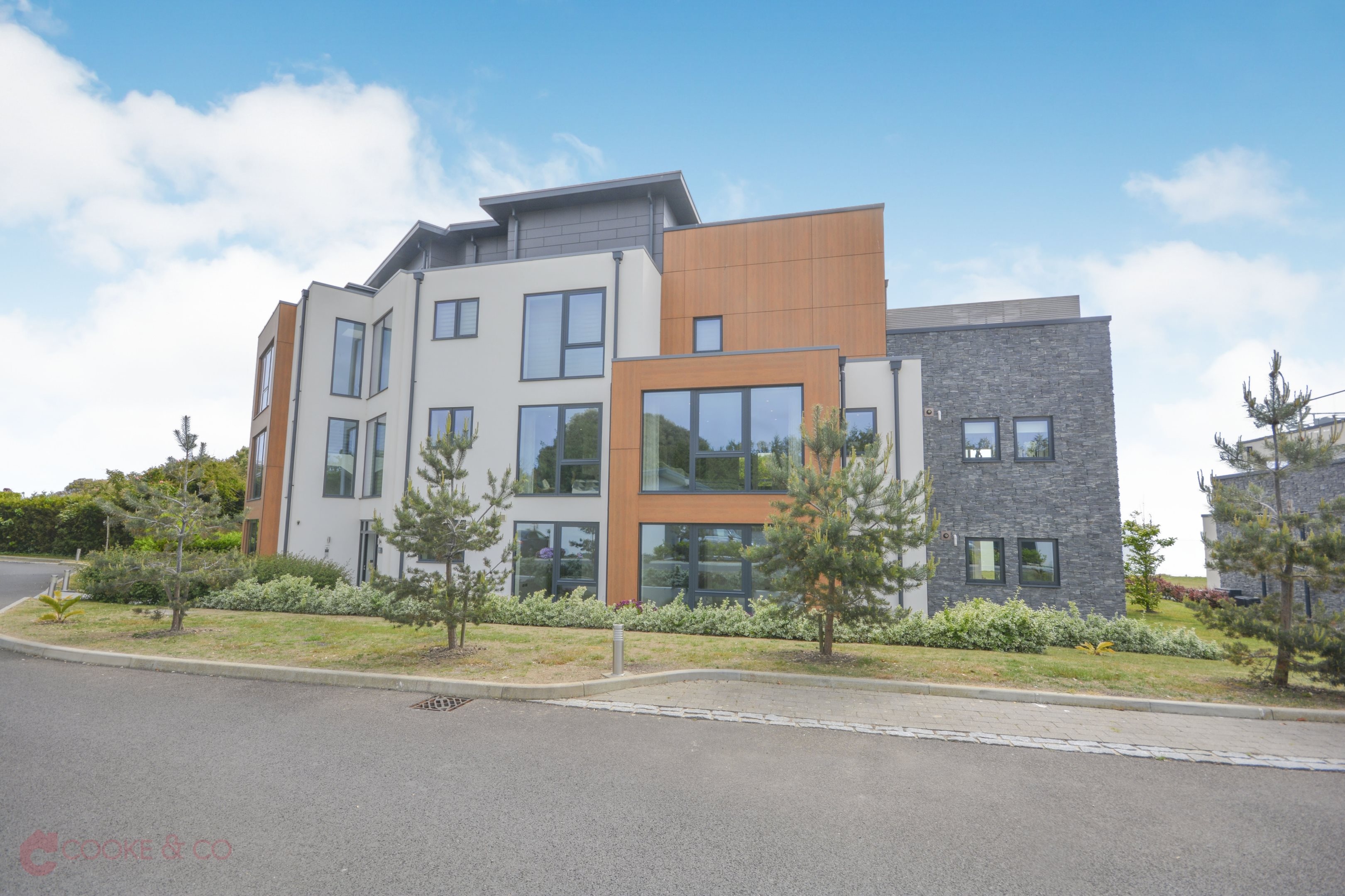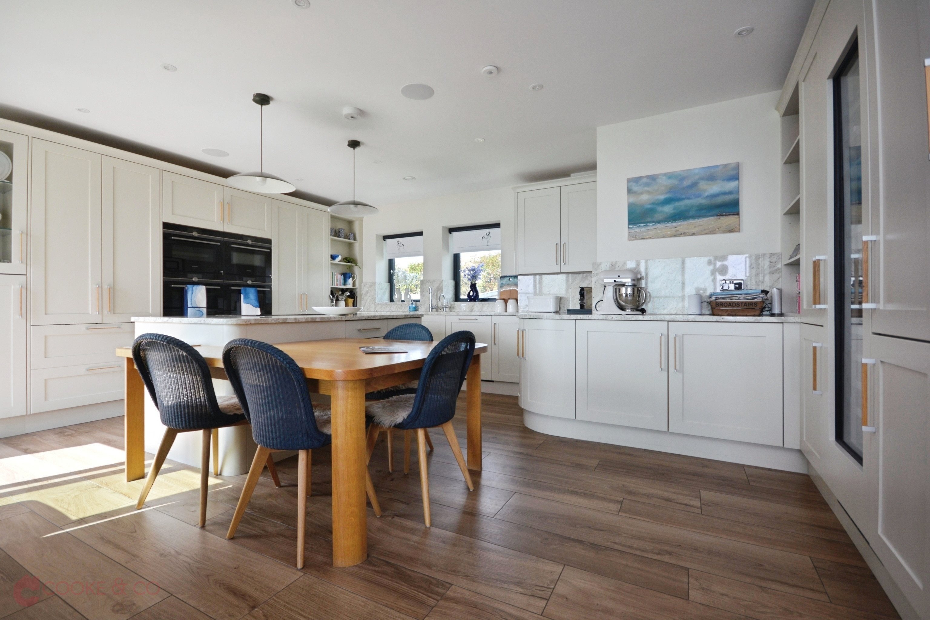 Windows to front and rear. Matching array of 'Small Bone' wall and base units with complimentary granite work surfaces. Breakfast bar island. Sliding doors to front with panoramic sea views, tiled flooring throughout, electric inset fire, TV point, skirting, spot lighting, power points. Siemens integrated steamer double oven, Siemens integrated double microwave, double sink with mixer taps and gas controlled automatic Hot Tap which also dispenses filtered cold water, Siemens studio line induction hob, integrated dish washer, power points, granite splash backs, Siemens wine cooler. Rise and fall extractor fan for hob. Electric blinds and curtains controlled via 'Loxone' via a phone app and manually. Underfloor heating. Large Curved glass patio doors to balcony. Secondary door with access to balcony.