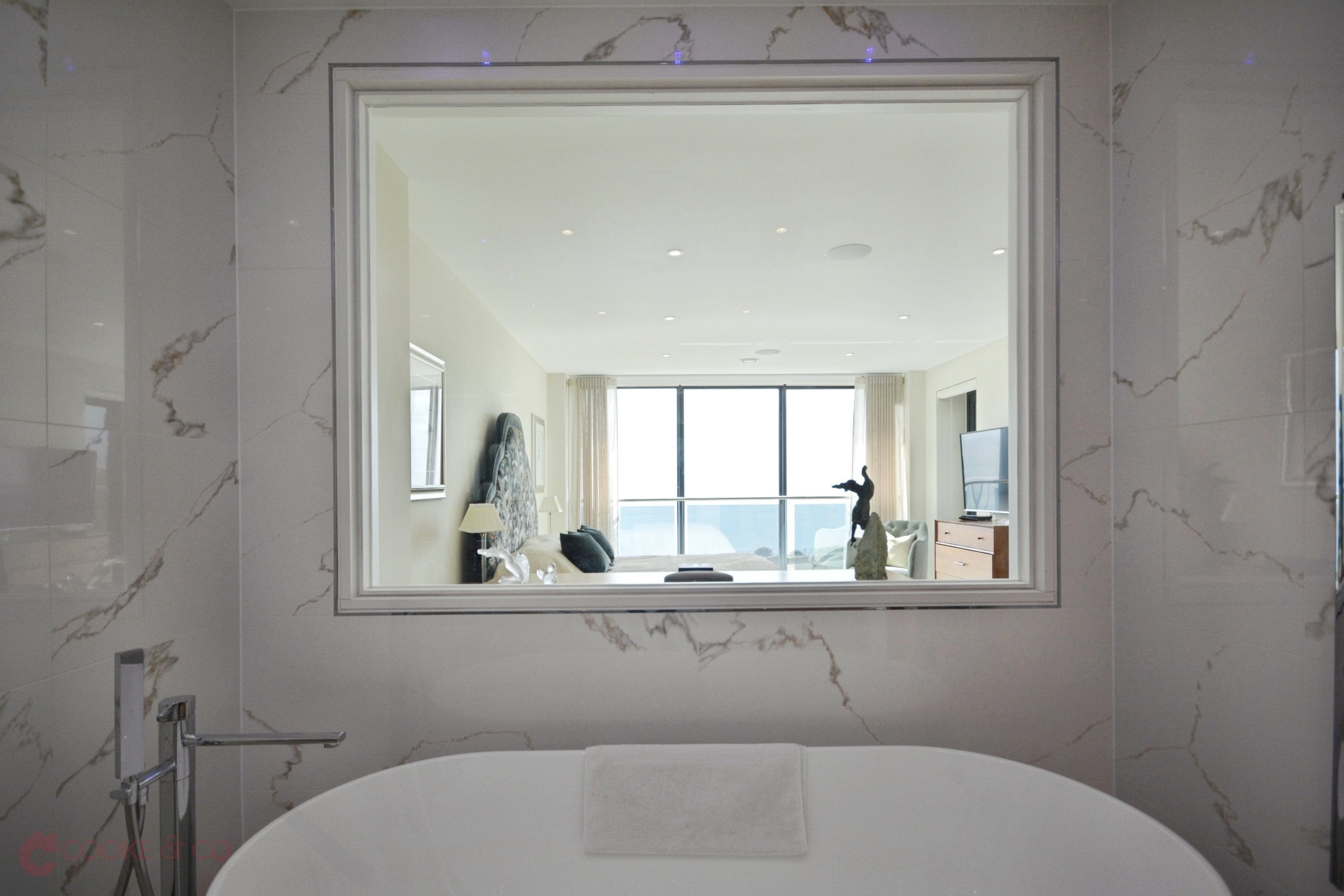 Window to rear with panoramic sea views, low level w/c, tiled flooring and walls with marble effect, twin sinks with mixer taps and built in vanity unit, walk in shower, heated chrome towel rail. Electric shaver/toothbrush charging points. Underfloor heating.