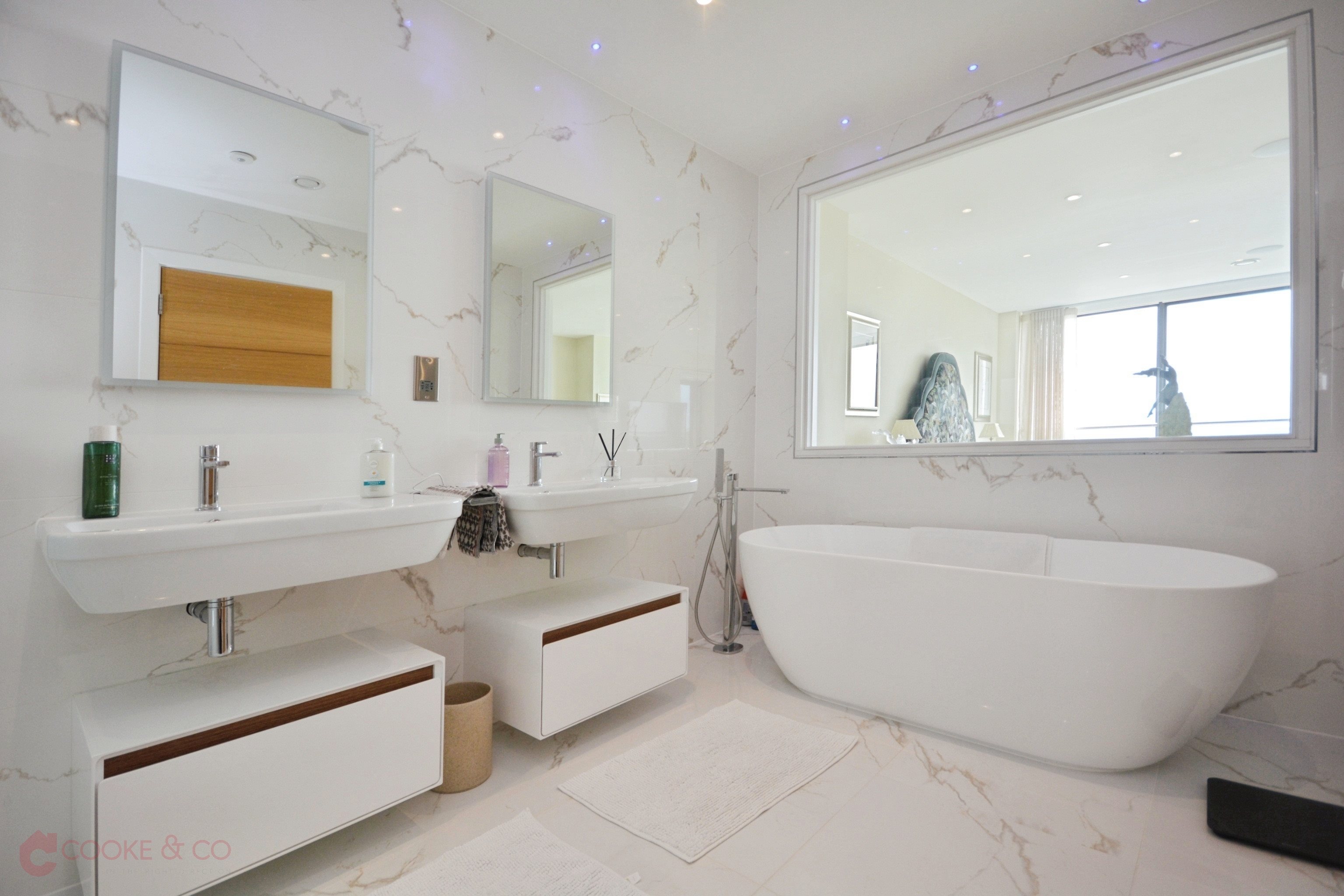 Window to front, marble effect tiles and walls, sink with mixer taps and built in vanity unit, walk in shower cubicle, low level w/c, heated chrome towel rail. Electric shaver/toothbrush charging points. Underfloor heating.