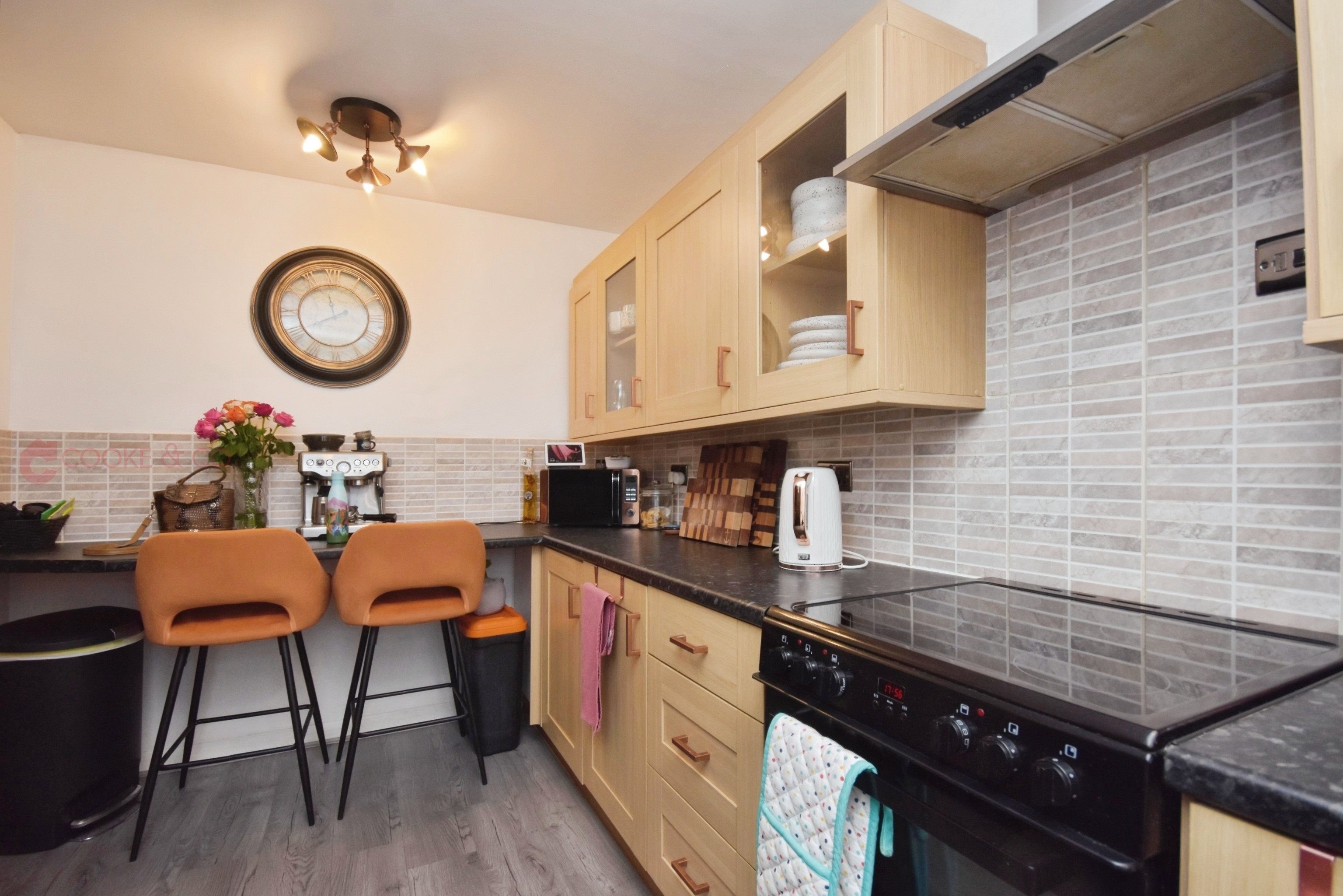 Windows to front. Matching array of wall and base units with complimentary work surfaces, Laminate flooring, space for oven, space for fridge/freezer, space for dish washer, sink with mixer taps. Power points. Breakfast bar area.