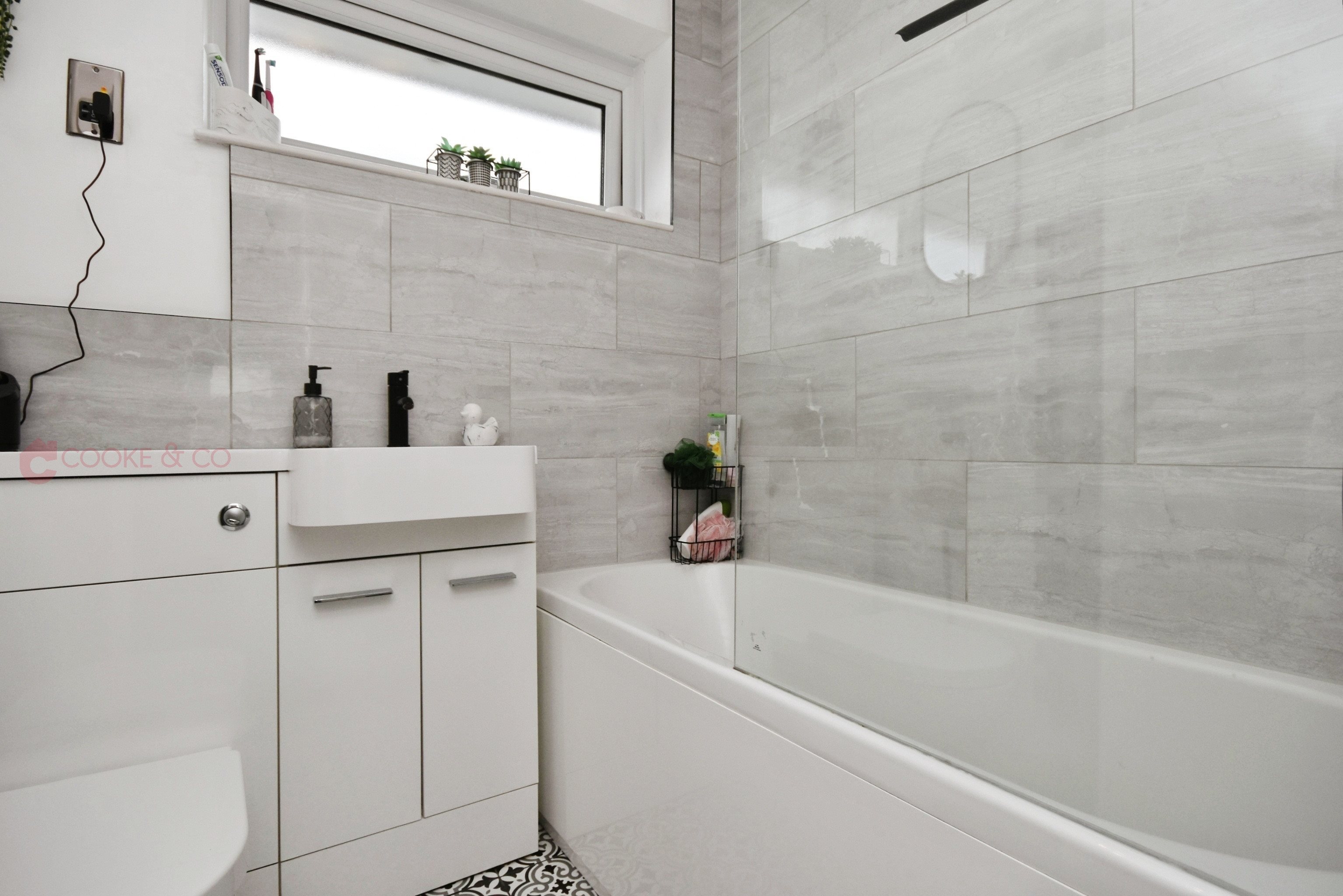Window frosted to front, bath with shower and shower attachment, tiled flooring, sink with mixers and build in storage cupboard, heated towel rail.