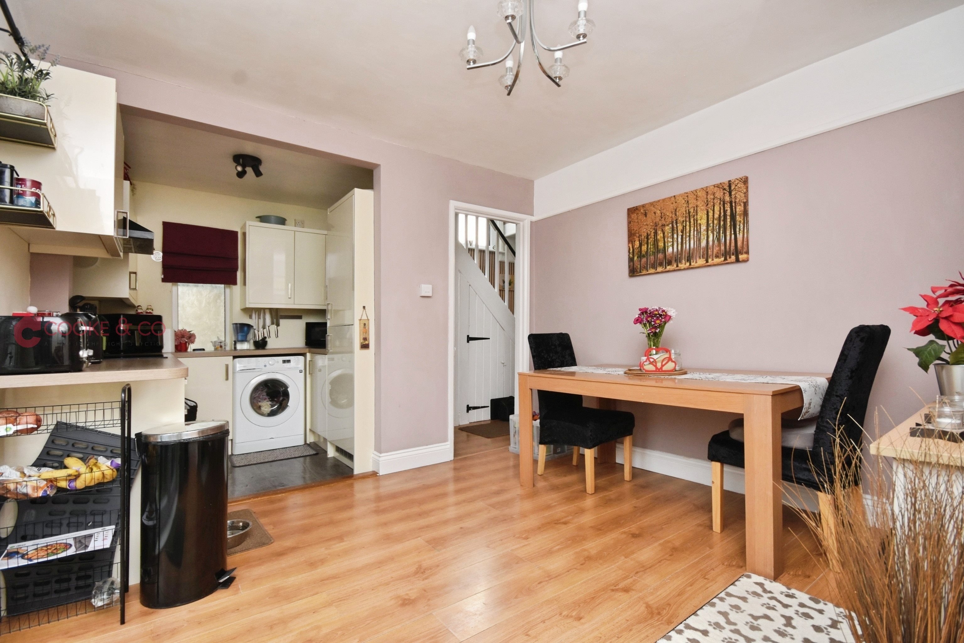 Matching array of Wren wall base units with complimentary work surface. Window to side, wooden flooring, integrated oven, integrated fridge freezer, integrated dish washer, space for washing machine, extractor hood, sink with mixer taps, skidding, built in storage, picture rails, electric fire, storage cupboard, french doors to rear garden.