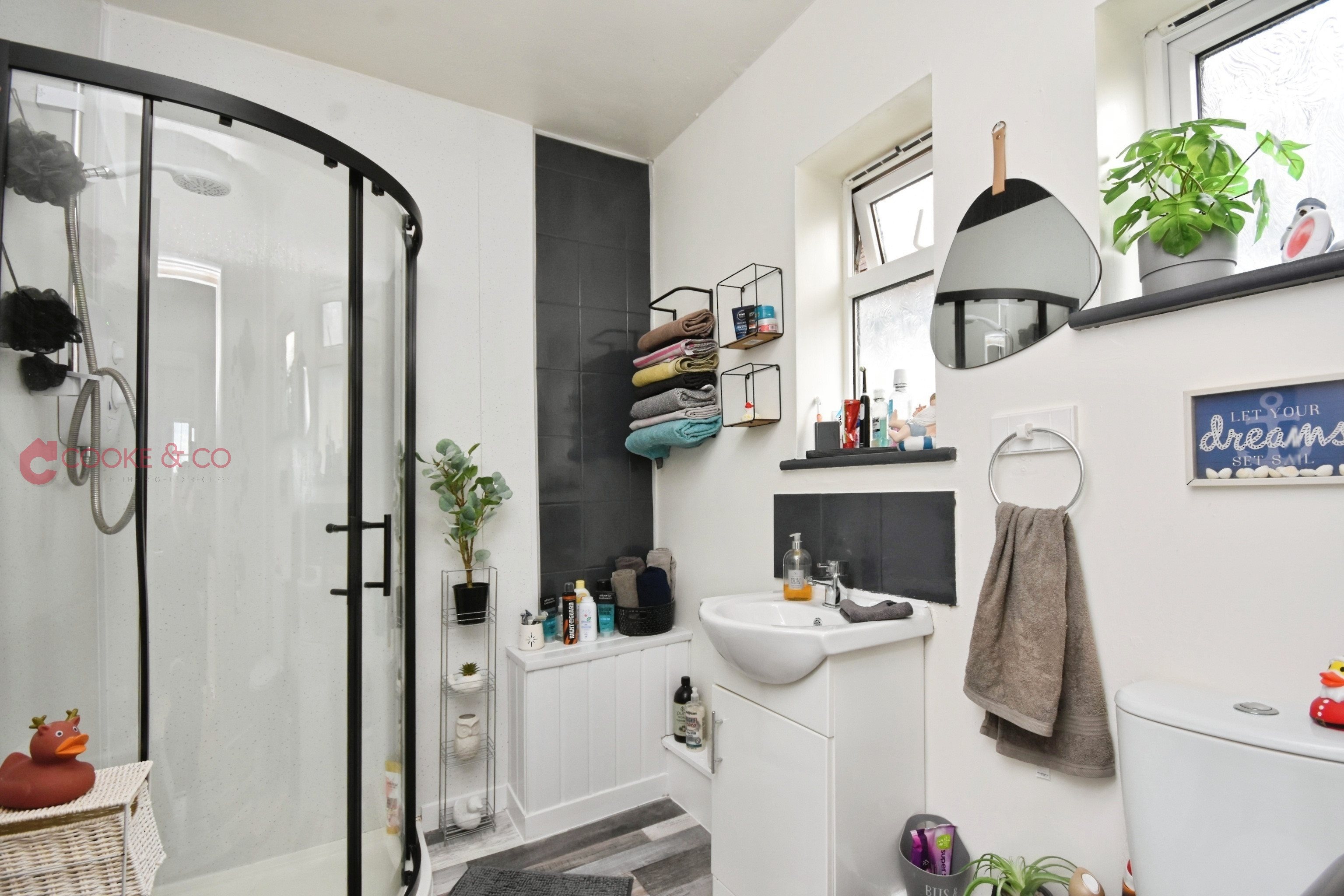Frosted window to side, sink with mixer taps, low level w/c, vinyl flooring, shower cubicle, radiator, splash back.