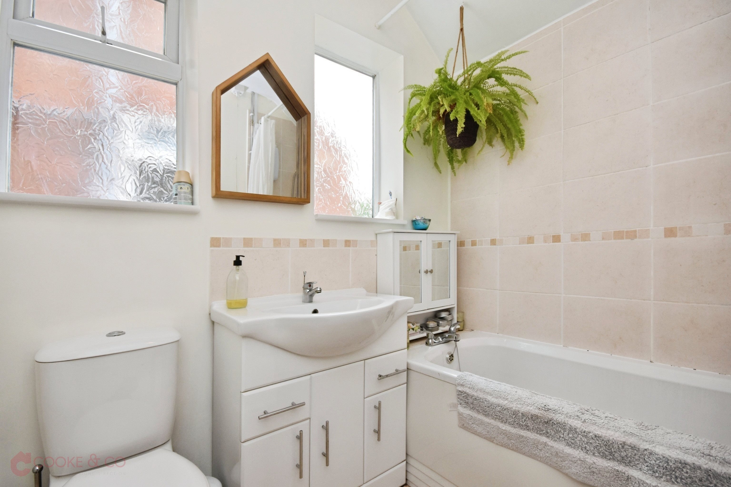 Frosted windows to side, low level W/C, vinyl flooring. Bath with mixer taps, sink with hot and cold taps and built in storage units, heated chrome towel rail.