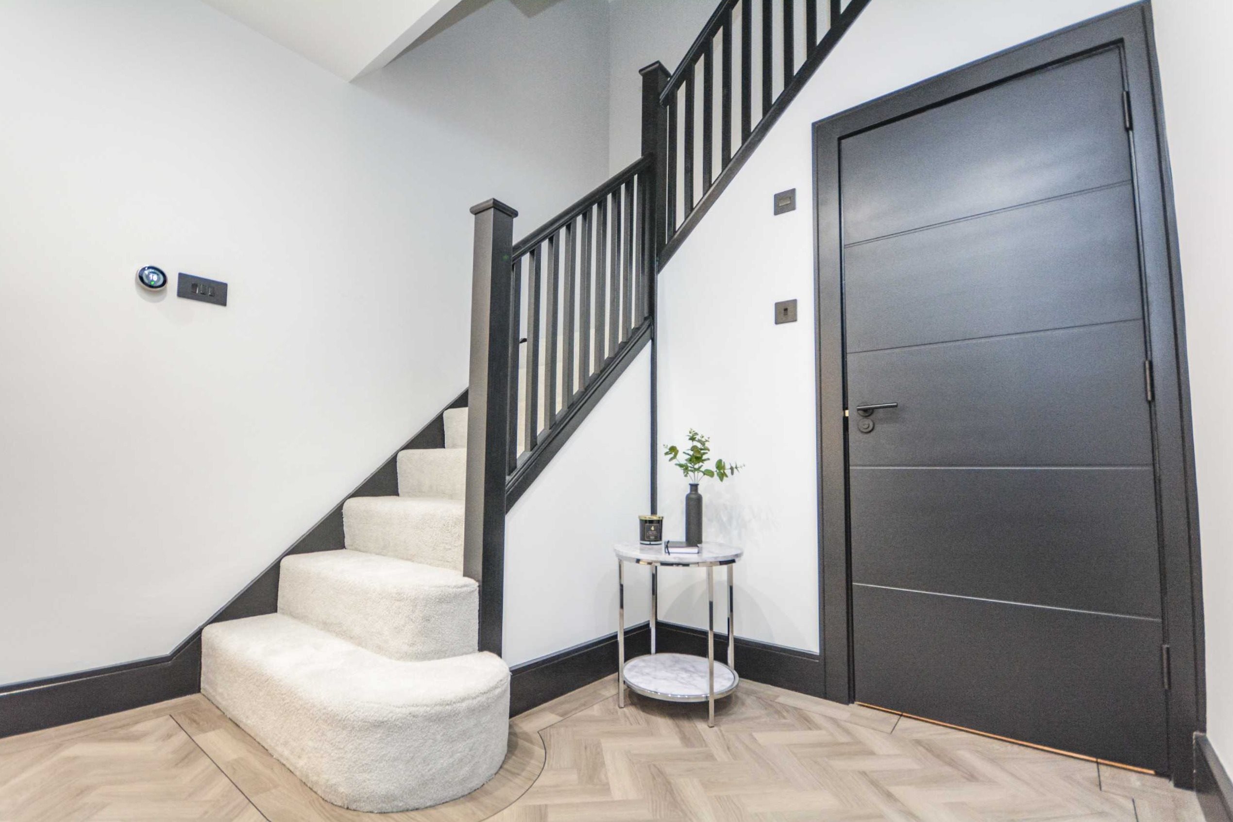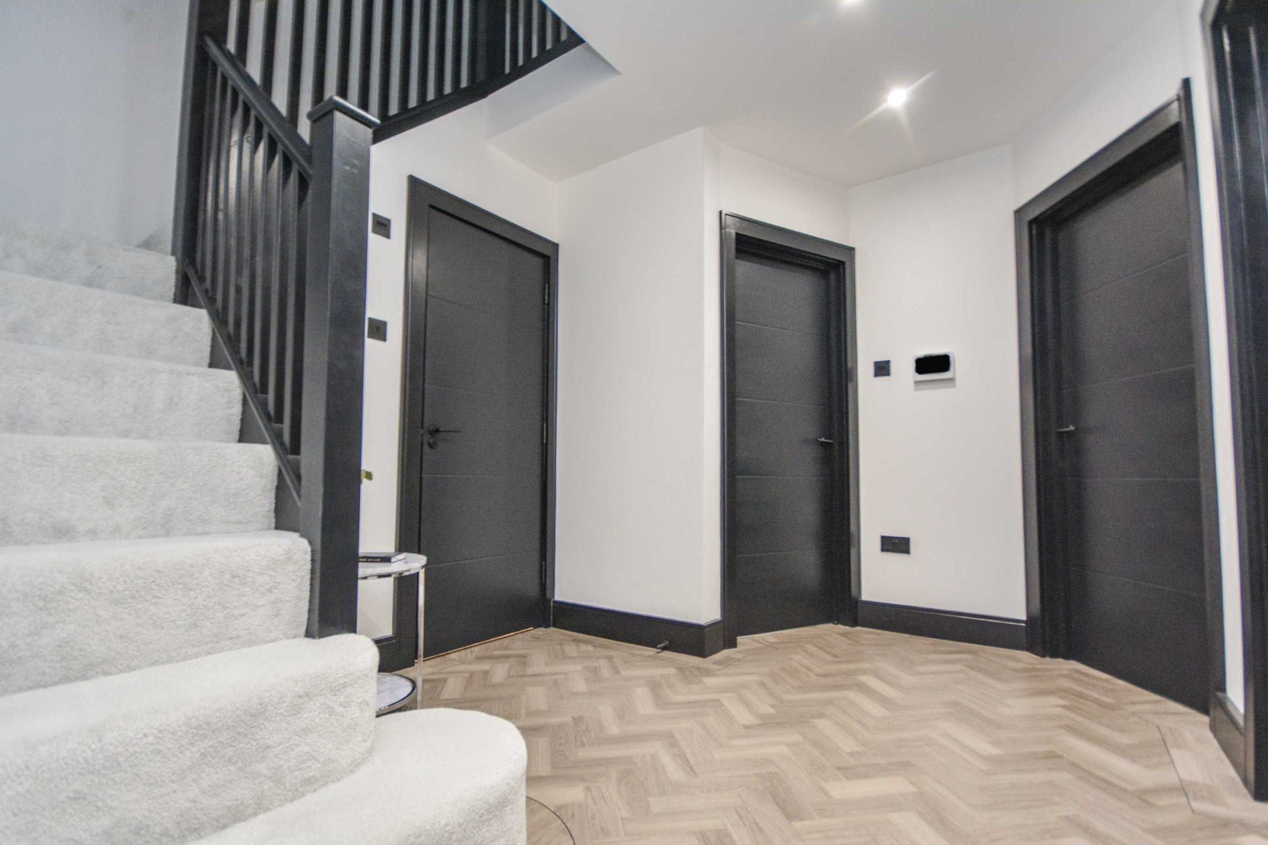 Upstairs, the stunning primary bedroom features skylights, air conditioning, and a luxurious en-suite with a walk-in shower. A modern family bathroom and additional air-conditioned bedrooms complete this elegant home. Throughout, you'll find beautiful herringbone flooring, adding a touch of sophistication.