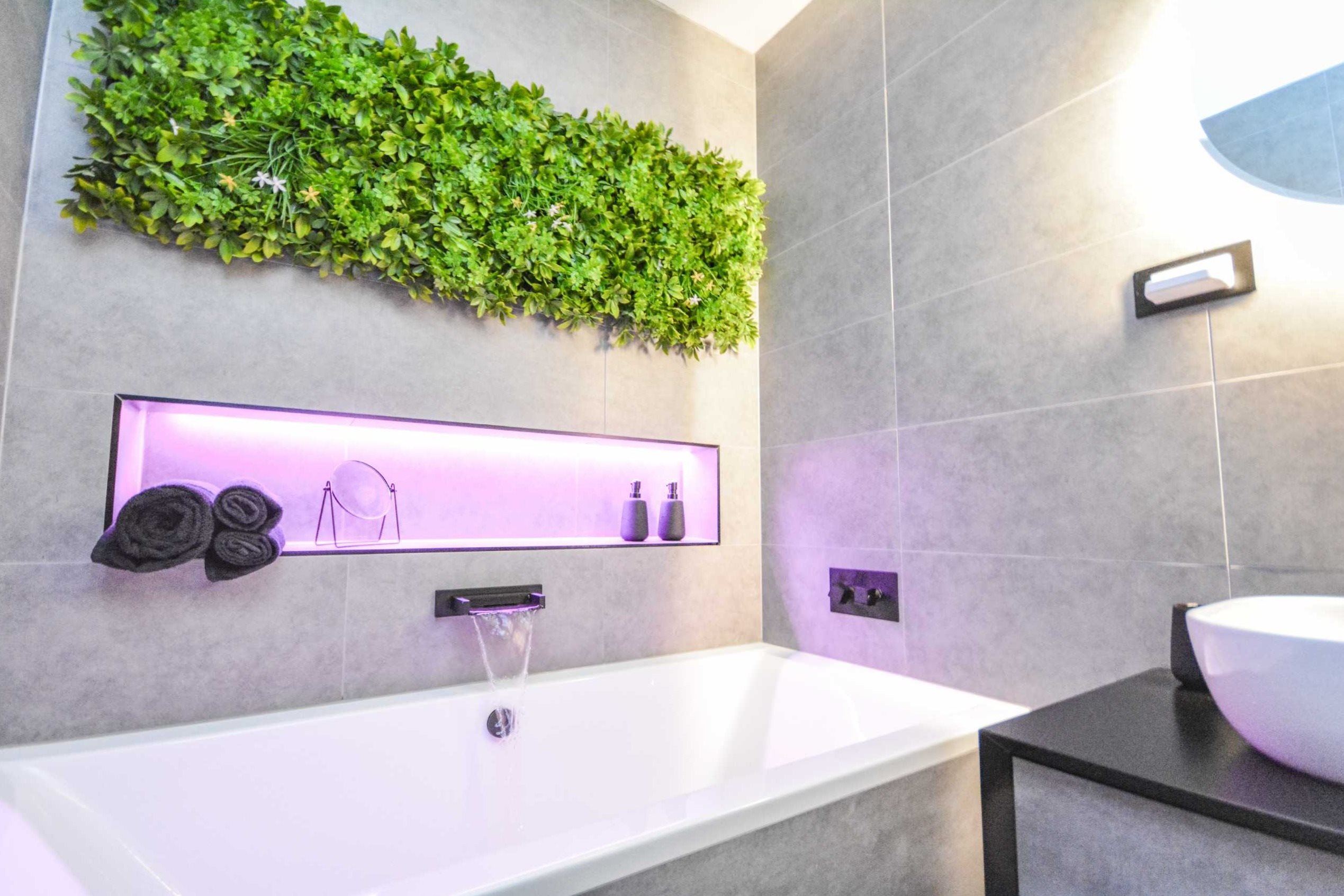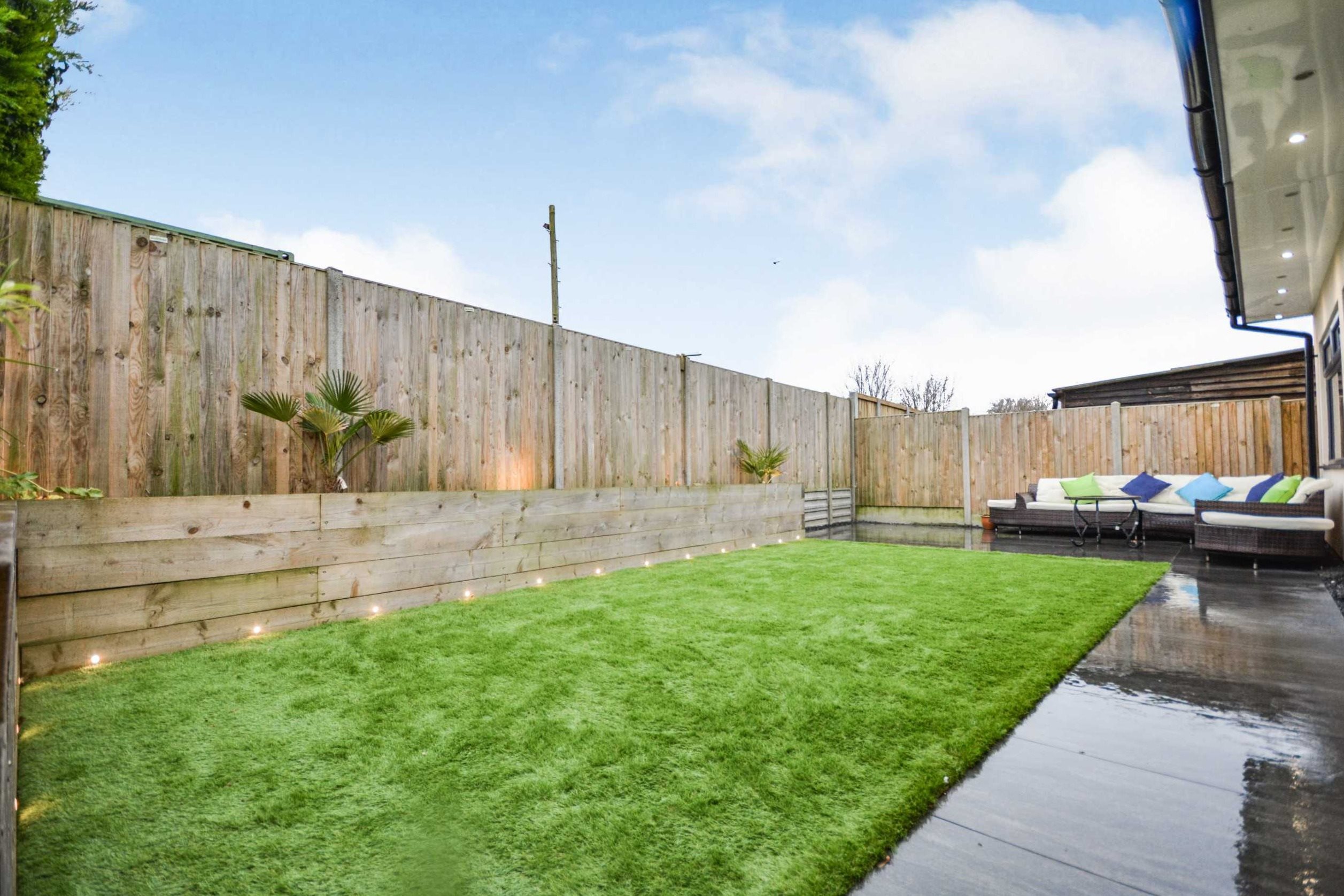 Step inside to find a bright, spacious hallway with a Hikvision smart entry system, leading to two air-conditioned double bedrooms. The open-plan living and dining area is both stylish and functional, featuring a cozy biofuel fireplace and seamless access to a landscaped garden, perfect for relaxing by the fire pit. The sleek kitchen, complete with integrated appliances, is complemented by a utility room and W/C.