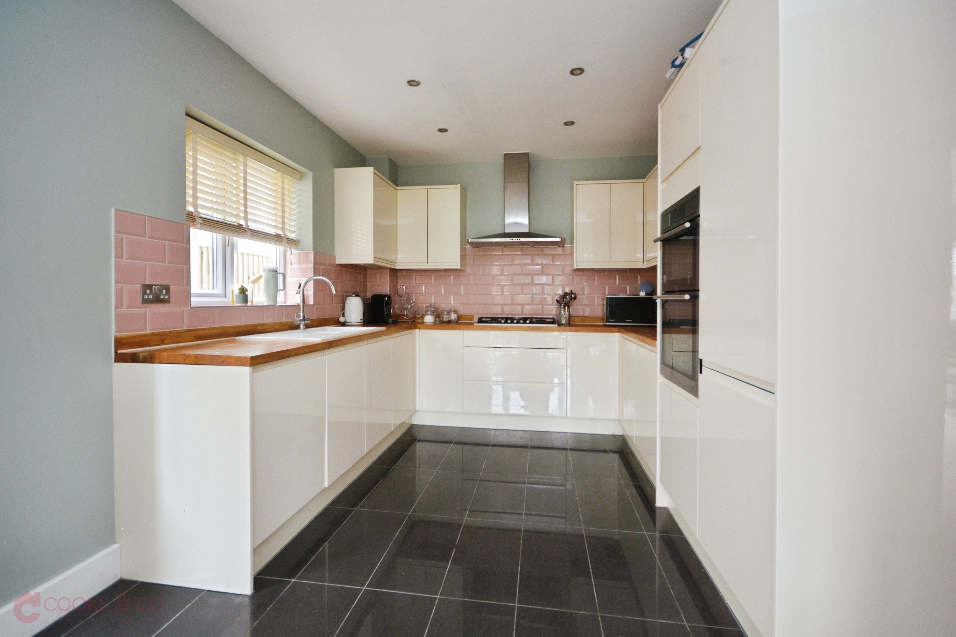 Entrance Via UPVC door into; Hallway Hard engineered oak flooring. Storage cupboards. Study 11'0 x 6'11 (3.35m x 2.11m) Bay window to front, hard engineered oak flooring, skirting, power points Downstairs Toilet 7'04 x 4'06 (2.24m x 1.37m) Window frosted to side, tiled flooring, sink with mixers, low level w/c, skirting Kitchen 14'01 x 9'08 (4.29m x 2.95m) Window to side, tiled splash, four burner gas hob, extractor hood, integrated oven, integrated fridge/freezer, integrated dish washer. Sink with mixer taps. Hard engineered oak flooring. Power points. Skirting. Doors to; Dining Room 14'07 x 9'08 (4.44m x 2.95m) Window to side. Doors to rear with access to garden, hard engineered oak flooring, power points, skirting. Radiator. Lounge 17'09 x 13'09 (5.41m x 4.19m) Windows to rear. Doors with access to rear garden, skirting, carpeted, power points, TV point. Radiator. Stairs To First Floor Carpeted stairs leading to; Landing Storage cupboard. Bedroom 14'03 x 9'10 (4.34m x 3m) Window to front, skirting, radiator, power points, carpeted. Bedroom 13'06 x 10'09 (4.11m x 3.28m) Windows to rear, carpeted, built in wardrobe, power points, skirting, radiator. Bedroom 14'0 x 10'09 (4.27m x 3.28m) Windows to rear, carpeted, skirting, power points, radiator. Bedroom 11'11 x 15'09 (3.63m x 4.8m) Windows to front, carpeted, skirting, power points, radiator. En-Suite Shower Room 7'09 x 4'11 (2.36m x 1.5m) Window to side, walk in shower, heated chrome towel rail, tiled flooring Bathroom 8'07 x 7'09 (2.62m x 2.36m) Frosted window to side, bath with shower attachments, sink with mixers, low level, tiled walls and flooring, heated chrome towel rail. Front Garden Rear Garden Garage 19'07 x 9'02 (5.97m x 2.79m) Integral access. Worchester combi boiler. Space and plumbing for washing machine, sink with mixer taps, door to side with access to rear garden, electric operated up and over garage door.