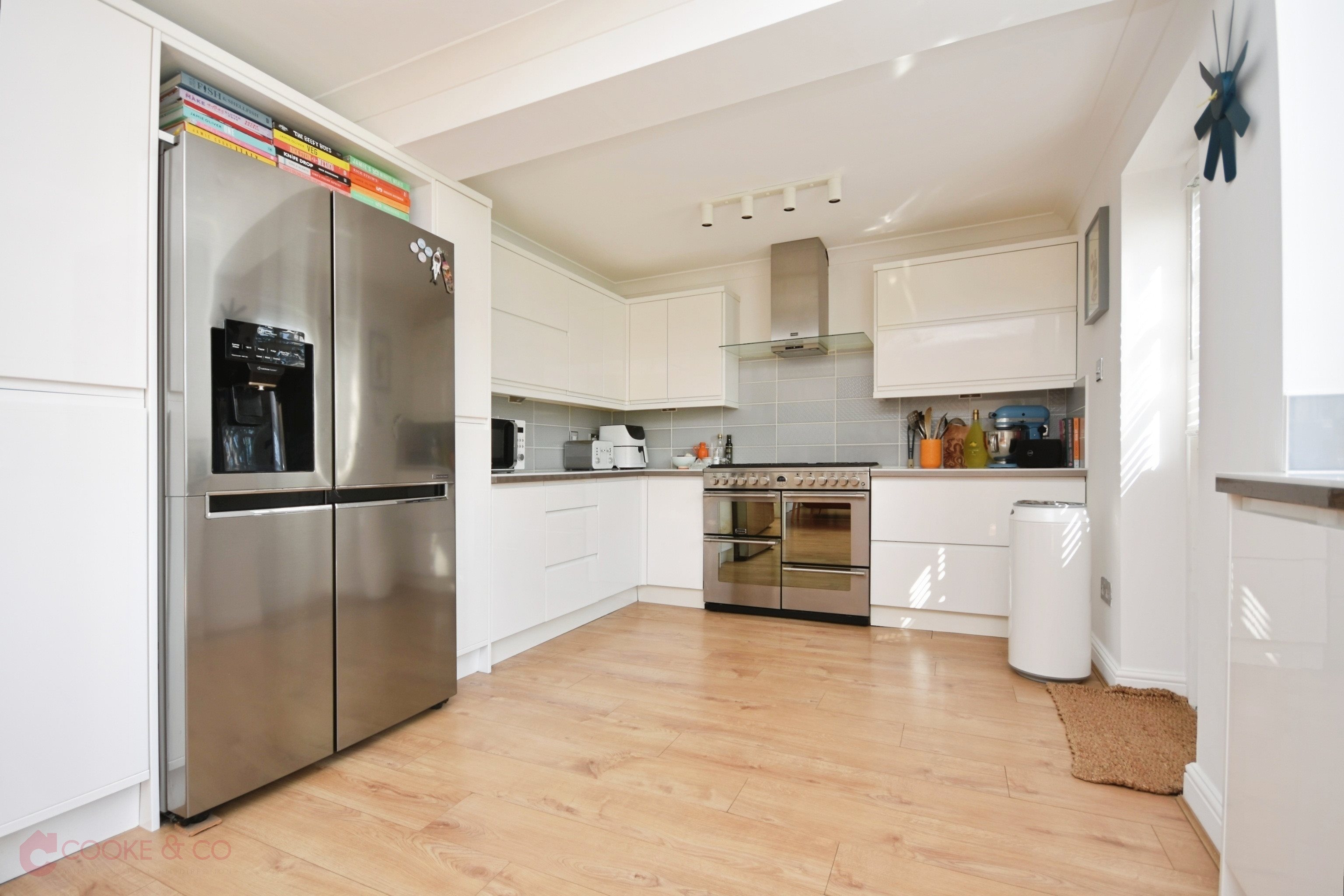 Windows to rear, laminate flooring, pull out larder, integrated dish washer, free standing oven, integrated washing machine, sink with mixers and draining board, tiled splash backs, stable door to rear garden, french double doors to rear garden, power points, TV point, radiator.