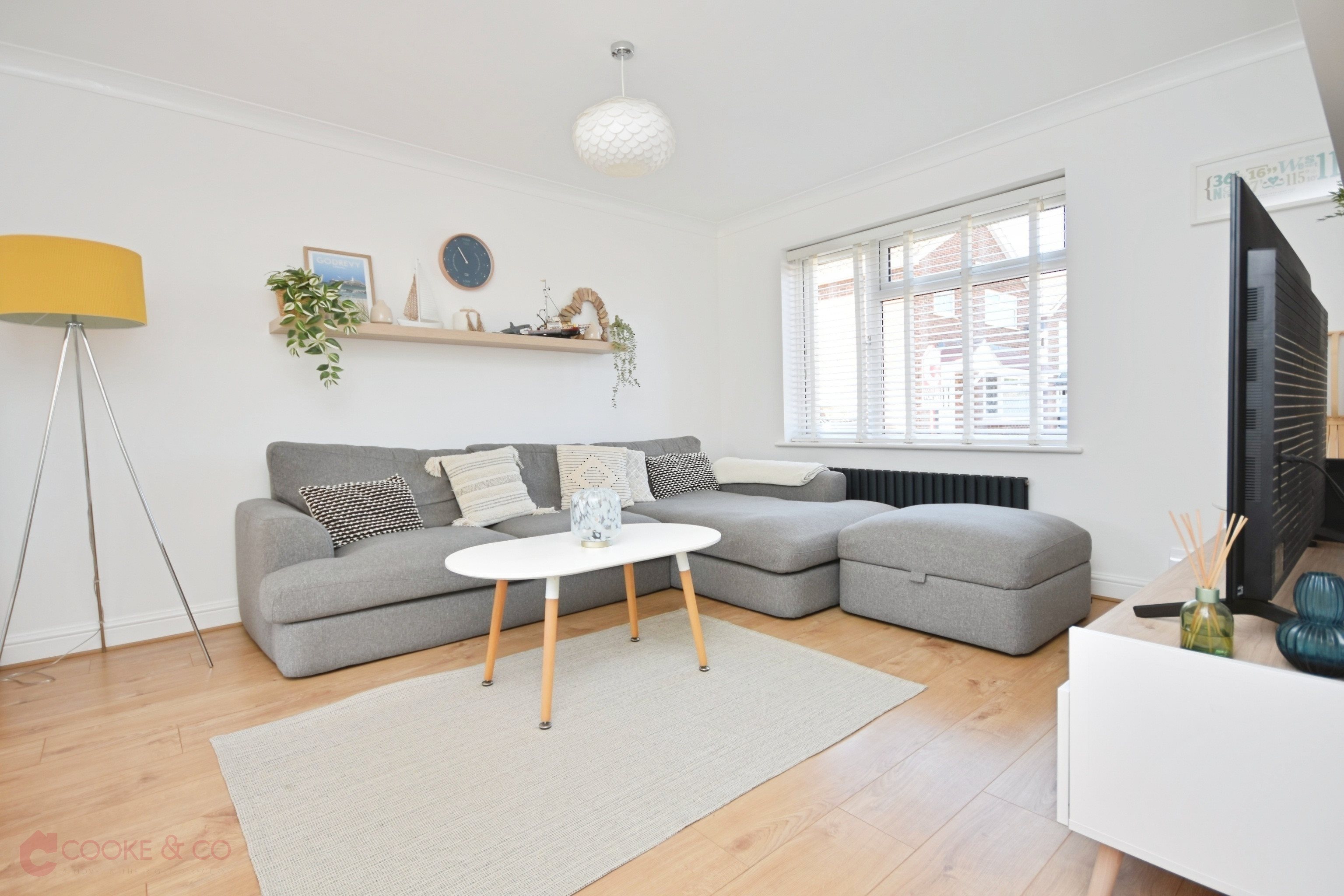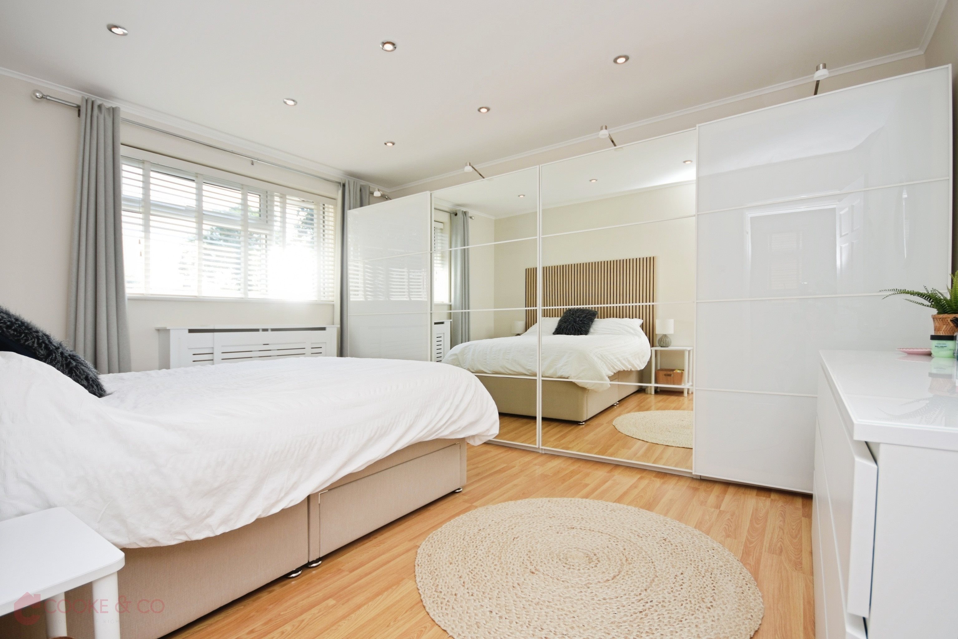 Windows to front, radiator, laminate flooring, Power points, skirting and coving.