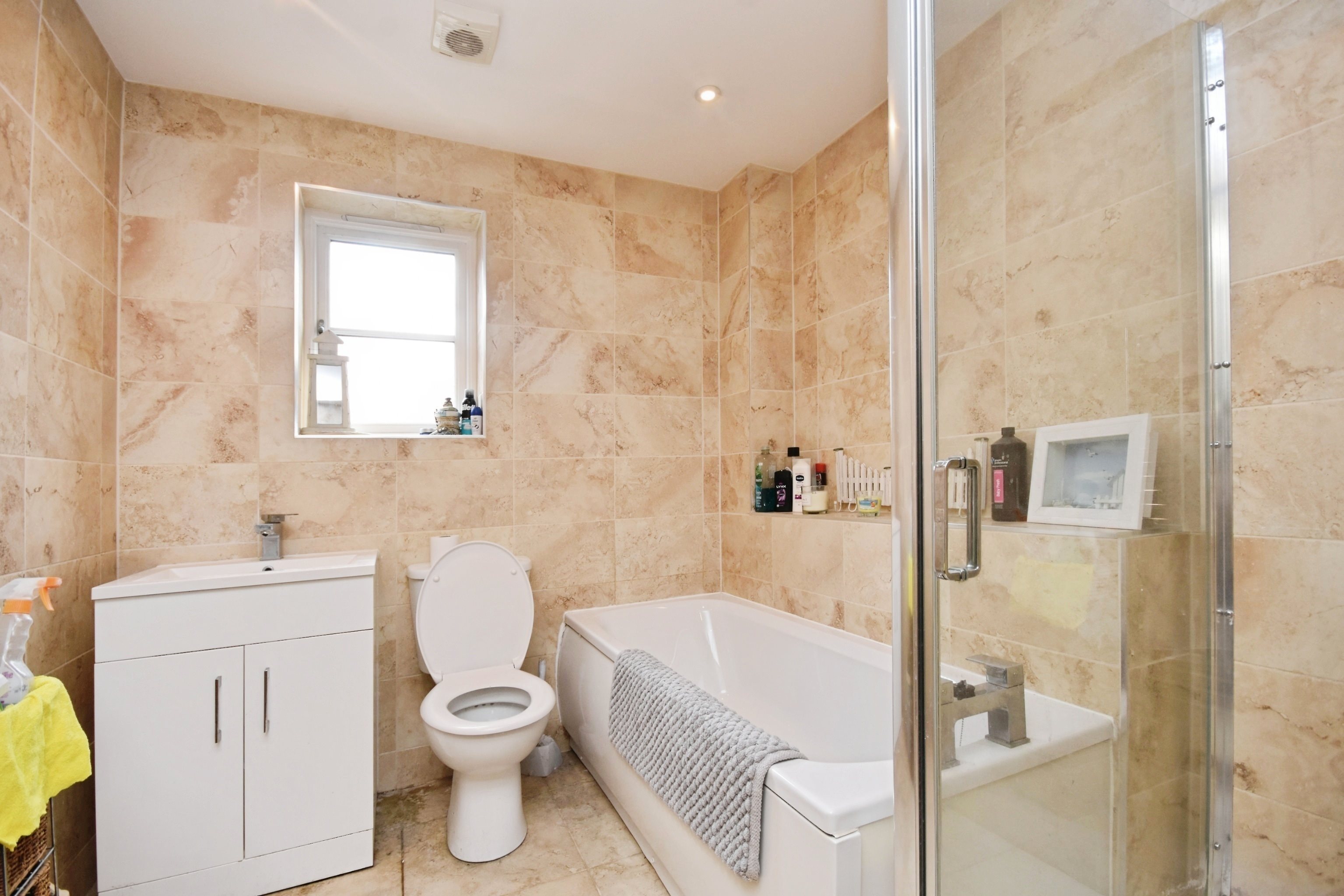 Double glazed frosted windows to front, tiled walls and flooring, bath with mixer taps, shower cubicle, low level w/c, sink with mixer taps.
